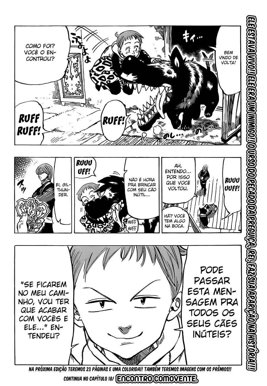 Capítulo 0Capítulo 1 - Os Sete Pecados CapitaisCapítulo 2 - A Espada do PaladinoCapítulo 3 - Algo que Eu Devo FazerCapítulo 4 - O Pecado da Floresta AdormecidaCapítulo 5 - Memória na EscuridãoCapítulo 6 - O Paladino GilthunderCapítulo 7 - O Prisioneiro da EscuridãoCapítulo 8 - O Sonho da GarotaCapítulo 9 - Não Pode Ser TocadoCapítulo 10 - A Maldade InvisívelCapítulo 11 - Mesmo se Você MorrerCapítulo 12 - Uma Festa de ConfusõesCapítulo 13 - Determinação DedicadaCapítulo 14 - ExplosãoCapítulo 15 - O Pequeno EncontroCapítulo 16 - Balada do ComeçoCapítulo 17 - Premonição de TempestadeCapítulo 18 - Reunião TocanteCapítulo 19 - Pecado da GanânciaCapítulo 20 - Dois CaminhosCapítulo 21 - Cavaleiro VingadorCapítulo 22 - Perseguidor TerrívelCapítulo 23 - Algum Dia, DefinitivamenteCapítulo 24 - Lendas EncurraladasCapítulo 25 - Quatro Contra Um, Por FavorCapítulo 26 - Partindo com o MortoCapítulo 27 - A Chuva Sem EmoçõesCapítulo 28 - Homem PerigosoCapítulo 29 - Pulso SombrioCapítulo 30 - Venham! O Festival dos CanalhasCapítulo 31 - Festival de Luta de ByzelCapítulo 32 - Grupo de Lutadores PoderososCapítulo 33 - Previsão de Grande CaosCapítulo 34 - Meliodaz Contra BaanCapítulo 35 - Meliodas RoubadoCapítulo 36 - O Momento de PiscarCapítulo 37 - Se Aproximando da Chance de EncontroCapítulo 38 - Necessidade e AcasoCapítulo 39 - Sentimento de MuitosCapítulo 40 - As Finais do Festival de Luta de ByzelCapítulo 41 - O Choque AssustadorCapítulo 42 - Reator DemônioCapítulo 43 - Aposta PerigosaCapítulo 44 - Contagem Regressiva para o DesesperoCapítulo 45 - Carnaval ViolentoCapítulo 46 - Porque Somos IrmãsCapítulo 47 - Discípulo da DestruiçãoCapítulo 48 - Feliz AniquilaçãoCapítulo 49 - Retirada ForçadaCapítulo 50 - Após o FestivalCapítulo 51 - Profundamente no CoraçãoCapítulo 52 - A Verdade do RumorCapítulo 53 - O Gigante Armado Contra Dawn RoarCapítulo 54 - O Homem que Não se MoveCapítulo 55 - Aquele Homem que Não tem EmoçõesCapítulo 56 - O Cavaleiro ProfanoCapítulo 57 - Acontecimentos de Muito Tempo AtrásCapítulo 58 - Decisão ForçadaCapítulo 59 - Um Homem Imprevisível Entra em CenaCapítulo 60 - Se Metendo em ConfusãoCapítulo 61 - Lendas Não CitadasCapítulo 62 - Vilões ImparáveisCapítulo 63 - Arthur PendragonCapítulo 64 - A Estratégia de Infiltração do Reino!!Capítulo 65 - Um Conflito InevitávelCapítulo 66 - Primeiro InfortúnioCapítulo 67 - FendaCapítulo 68 - Diferença Esmagadora de PoderCapítulo 69 - Todo Mundo Tem uma Primeira VezCapítulo 70 - Grande Paladino AtormentadoCapítulo 71 - Aquilo que Vive na EscuridãoCapítulo 72 - O Homem que Estava Muito AtrasadoCapítulo 73 - Mesmo que Eu Tenha que Destruir Minha VidaCapítulo 74 - A Promessa CumpridaCapítulo 75 - O Que Faz um ReiCapítulo 76 - As Convicções das PrincesasCapítulo 77 - Sentimentos por ElaCapítulo 78 - Em Troca da Minha VidaCapítulo 79 - Mais Uma VezCapítulo 80 - Virando a MesaCapítulo 81 - Único Ataque do MeliodasCapítulo 82 - Feitiço da CoragemCapítulo 83 - Porco CarmesimCapítulo 84 - Tudo Está Bem Quando Termina BemCapítulo 85 - O Começo da FestaCapítulo 86 - Ameaça IminenteCapítulo 87 - A Fúria e a GanânciaCapítulo 88 - Esse Mundo é Como um InfernoCapítulo 89 - Desejo SinceroCapítulo 90 - O Que eu Posso Fazer Por VocêCapítulo 91 - Existência DetestávelCapítulo 92 - A Luta Final ComeçaCapítulo 93 - Vermelho e CinzaCapítulo 94 - Caindo em DesesperoCapítulo 95 - Esperança que DesvaneceCapítulo 96 - HawkCapítulo 97 - ElizabethCapítulo 98 - PreceCapítulo 99 - ConclusãoCapítulo 100 - Os HeróisCapítulo 101 - O Poder do AmorCapítulo 102 - Premonição de um AdeusCapítulo 103 - A Nova JornadaCapítulo 104 - O Retorno do Rei das FadasCapítulo 105 - Um NinguémCapítulo 106 - O Olho Demoníaco de BalorCapítulo 107 - À Procura da VerdadeCapítulo 108 - Despertar GentilCapítulo 109 - TerremotoCapítulo 110 - ConfissãoCapítulo 111 - Como Um Homem DiziaCapítulo 112 - Existência e ProvaCapítulo 113 - RevelaçãoCapítulo 114 - Heróis HesitantesCapítulo 115 - De Volta ao PesadeloCapítulo 116 - O Tesouro Sagrado LostvayneCapítulo 117 - Os Dois Reis das FadasCapítulo 118 - Confronto!! A Floresta do Rei das FadasCapítulo 119 - Os Dez Mandamentos Começam a AgirCapítulo 120 - Violência EsmagadoraCapítulo 121 - Previsão ImpossívelCapítulo 122 - O Massacre dos DemôniosCapítulo 123 - A Redenção do Capitão dos PaladinosCapítulo 124 - O Que a Amizade nos TrouxeCapítulo 125 - Acabem com os "Dez Mandamentos"!!Capítulo 126 - Para Onde as Memórias VãoCapítulo 127 - Reunião com o DesesperoCapítulo 128 - Existência ArroganteCapítulo 129 - A Terra Sagrada dos DruidasCapítulo 130 - A Dor que Gentilmente MataCapítulo 131 - A Promessa Com a Minha AmadaCapítulo 132 - Aquilo que nos FaltaCapítulo 133 - Impaciência e AnsiedadeCapítulo 134 - À Você, Que Não é Mais Meu CapitãoCapítulo 135 - Meras Boas VindasCapítulo 136 - Disseminando o MedoCapítulo 137 - Aqui Entre Eu e VocêCapítulo 138 - Batalha Contra as TrevasCapítulo 139 - Conte-me Sobre o Seu PassadoCapítulo 140 - O Ladrão e o GarotoCapítulo 141 - Pai e FilhoCapítulo 142 - Onde o Amor EstáCapítulo 143 - O Grito da Donzela SagradaCapítulo 144 - Aquele Homem da "Ganância"Capítulo 145 - Bela AlmaCapítulo 146 - Adeus, Meu Amado LadrãoCapítulo 147 - Perseguição MortalCapítulo 148 - Galan GameCapítulo 149 - A Magia de GalanCapítulo 150 - Mestre do SolCapítulo 151 - O Palco Espera por NósCapítulo 152 - Atraídos pela Luz da VelaCapítulo 153 - A Confissão AterrorizanteCapítulo 154 - O Diabo SorriCapítulo 155 - Labirinto da Armadilha da MorteCapítulo 156 - Desafio de Exploração do LabirintoCapítulo 157 - A Dança Caótica dos DesafiantesCapítulo 158 - Os Heróis da FoliaCapítulo 159 - Palavras Não São NecessáriasCapítulo 160 - Vão!! SuperemCapítulo 161 - Aqueles da LendaCapítulo 162 -