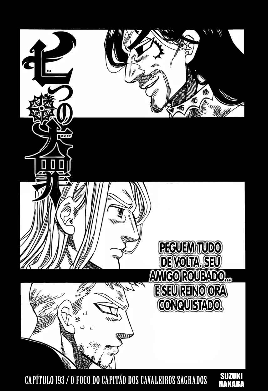 Capítulo 0Capítulo 1 - Os Sete Pecados CapitaisCapítulo 2 - A Espada do PaladinoCapítulo 3 - Algo que Eu Devo FazerCapítulo 4 - O Pecado da Floresta AdormecidaCapítulo 5 - Memória na EscuridãoCapítulo 6 - O Paladino GilthunderCapítulo 7 - O Prisioneiro da EscuridãoCapítulo 8 - O Sonho da GarotaCapítulo 9 - Não Pode Ser TocadoCapítulo 10 - A Maldade InvisívelCapítulo 11 - Mesmo se Você MorrerCapítulo 12 - Uma Festa de ConfusõesCapítulo 13 - Determinação DedicadaCapítulo 14 - ExplosãoCapítulo 15 - O Pequeno EncontroCapítulo 16 - Balada do ComeçoCapítulo 17 - Premonição de TempestadeCapítulo 18 - Reunião TocanteCapítulo 19 - Pecado da GanânciaCapítulo 20 - Dois CaminhosCapítulo 21 - Cavaleiro VingadorCapítulo 22 - Perseguidor TerrívelCapítulo 23 - Algum Dia, DefinitivamenteCapítulo 24 - Lendas EncurraladasCapítulo 25 - Quatro Contra Um, Por FavorCapítulo 26 - Partindo com o MortoCapítulo 27 - A Chuva Sem EmoçõesCapítulo 28 - Homem PerigosoCapítulo 29 - Pulso SombrioCapítulo 30 - Venham! O Festival dos CanalhasCapítulo 31 - Festival de Luta de ByzelCapítulo 32 - Grupo de Lutadores PoderososCapítulo 33 - Previsão de Grande CaosCapítulo 34 - Meliodaz Contra BaanCapítulo 35 - Meliodas RoubadoCapítulo 36 - O Momento de PiscarCapítulo 37 - Se Aproximando da Chance de EncontroCapítulo 38 - Necessidade e AcasoCapítulo 39 - Sentimento de MuitosCapítulo 40 - As Finais do Festival de Luta de ByzelCapítulo 41 - O Choque AssustadorCapítulo 42 - Reator DemônioCapítulo 43 - Aposta PerigosaCapítulo 44 - Contagem Regressiva para o DesesperoCapítulo 45 - Carnaval ViolentoCapítulo 46 - Porque Somos IrmãsCapítulo 47 - Discípulo da DestruiçãoCapítulo 48 - Feliz AniquilaçãoCapítulo 49 - Retirada ForçadaCapítulo 50 - Após o FestivalCapítulo 51 - Profundamente no CoraçãoCapítulo 52 - A Verdade do RumorCapítulo 53 - O Gigante Armado Contra Dawn RoarCapítulo 54 - O Homem que Não se MoveCapítulo 55 - Aquele Homem que Não tem EmoçõesCapítulo 56 - O Cavaleiro ProfanoCapítulo 57 - Acontecimentos de Muito Tempo AtrásCapítulo 58 - Decisão ForçadaCapítulo 59 - Um Homem Imprevisível Entra em CenaCapítulo 60 - Se Metendo em ConfusãoCapítulo 61 - Lendas Não CitadasCapítulo 62 - Vilões ImparáveisCapítulo 63 - Arthur PendragonCapítulo 64 - A Estratégia de Infiltração do Reino!!Capítulo 65 - Um Conflito InevitávelCapítulo 66 - Primeiro InfortúnioCapítulo 67 - FendaCapítulo 68 - Diferença Esmagadora de PoderCapítulo 69 - Todo Mundo Tem uma Primeira VezCapítulo 70 - Grande Paladino AtormentadoCapítulo 71 - Aquilo que Vive na EscuridãoCapítulo 72 - O Homem que Estava Muito AtrasadoCapítulo 73 - Mesmo que Eu Tenha que Destruir Minha VidaCapítulo 74 - A Promessa CumpridaCapítulo 75 - O Que Faz um ReiCapítulo 76 - As Convicções das PrincesasCapítulo 77 - Sentimentos por ElaCapítulo 78 - Em Troca da Minha VidaCapítulo 79 - Mais Uma VezCapítulo 80 - Virando a MesaCapítulo 81 - Único Ataque do MeliodasCapítulo 82 - Feitiço da CoragemCapítulo 83 - Porco CarmesimCapítulo 84 - Tudo Está Bem Quando Termina BemCapítulo 85 - O Começo da FestaCapítulo 86 - Ameaça IminenteCapítulo 87 - A Fúria e a GanânciaCapítulo 88 - Esse Mundo é Como um InfernoCapítulo 89 - Desejo SinceroCapítulo 90 - O Que eu Posso Fazer Por VocêCapítulo 91 - Existência DetestávelCapítulo 92 - A Luta Final ComeçaCapítulo 93 - Vermelho e CinzaCapítulo 94 - Caindo em DesesperoCapítulo 95 - Esperança que DesvaneceCapítulo 96 - HawkCapítulo 97 - ElizabethCapítulo 98 - PreceCapítulo 99 - ConclusãoCapítulo 100 - Os HeróisCapítulo 101 - O Poder do AmorCapítulo 102 - Premonição de um AdeusCapítulo 103 - A Nova JornadaCapítulo 104 - O Retorno do Rei das FadasCapítulo 105 - Um NinguémCapítulo 106 - O Olho Demoníaco de BalorCapítulo 107 - À Procura da VerdadeCapítulo 108 - Despertar GentilCapítulo 109 - TerremotoCapítulo 110 - ConfissãoCapítulo 111 - Como Um Homem DiziaCapítulo 112 - Existência e ProvaCapítulo 113 - RevelaçãoCapítulo 114 - Heróis HesitantesCapítulo 115 - De Volta ao PesadeloCapítulo 116 - O Tesouro Sagrado LostvayneCapítulo 117 - Os Dois Reis das FadasCapítulo 118 - Confronto!! A Floresta do Rei das FadasCapítulo 119 - Os Dez Mandamentos Começam a AgirCapítulo 120 - Violência EsmagadoraCapítulo 121 - Previsão ImpossívelCapítulo 122 - O Massacre dos DemôniosCapítulo 123 - A Redenção do Capitão dos PaladinosCapítulo 124 - O Que a Amizade nos TrouxeCapítulo 125 - Acabem com os "Dez Mandamentos"!!Capítulo 126 - Para Onde as Memórias VãoCapítulo 127 - Reunião com o DesesperoCapítulo 128 - Existência ArroganteCapítulo 129 - A Terra Sagrada dos DruidasCapítulo 130 - A Dor que Gentilmente MataCapítulo 131 - A Promessa Com a Minha AmadaCapítulo 132 - Aquilo que nos FaltaCapítulo 133 - Impaciência e AnsiedadeCapítulo 134 - À Você, Que Não é Mais Meu CapitãoCapítulo 135 - Meras Boas VindasCapítulo 136 - Disseminando o MedoCapítulo 137 - Aqui Entre Eu e VocêCapítulo 138 - Batalha Contra as TrevasCapítulo 139 - Conte-me Sobre o Seu PassadoCapítulo 140 - O Ladrão e o GarotoCapítulo 141 - Pai e FilhoCapítulo 142 - Onde o Amor EstáCapítulo 143 - O Grito da Donzela SagradaCapítulo 144 - Aquele Homem da "Ganância"Capítulo 145 - Bela AlmaCapítulo 146 - Adeus, Meu Amado LadrãoCapítulo 147 - Perseguição MortalCapítulo 148 - Galan GameCapítulo 149 - A Magia de GalanCapítulo 150 - Mestre do SolCapítulo 151 - O Palco Espera por NósCapítulo 152 - Atraídos pela Luz da VelaCapítulo 153 - A Confissão AterrorizanteCapítulo 154 - O Diabo SorriCapítulo 155 - Labirinto da Armadilha da MorteCapítulo 156 - Desafio de Exploração do LabirintoCapítulo 157 - A Dança Caótica dos DesafiantesCapítulo 158 - Os Heróis da FoliaCapítulo 159 - Palavras Não São NecessáriasCapítulo 160 - Vão!! SuperemCapítulo 161 - Aqueles da LendaCapítulo 162 -