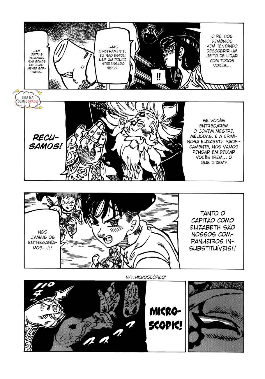 Capítulo 0Capítulo 1 - Os Sete Pecados CapitaisCapítulo 2 - A Espada do PaladinoCapítulo 3 - Algo que Eu Devo FazerCapítulo 4 - O Pecado da Floresta AdormecidaCapítulo 5 - Memória na EscuridãoCapítulo 6 - O Paladino GilthunderCapítulo 7 - O Prisioneiro da EscuridãoCapítulo 8 - O Sonho da GarotaCapítulo 9 - Não Pode Ser TocadoCapítulo 10 - A Maldade InvisívelCapítulo 11 - Mesmo se Você MorrerCapítulo 12 - Uma Festa de ConfusõesCapítulo 13 - Determinação DedicadaCapítulo 14 - ExplosãoCapítulo 15 - O Pequeno EncontroCapítulo 16 - Balada do ComeçoCapítulo 17 - Premonição de TempestadeCapítulo 18 - Reunião TocanteCapítulo 19 - Pecado da GanânciaCapítulo 20 - Dois CaminhosCapítulo 21 - Cavaleiro VingadorCapítulo 22 - Perseguidor TerrívelCapítulo 23 - Algum Dia, DefinitivamenteCapítulo 24 - Lendas EncurraladasCapítulo 25 - Quatro Contra Um, Por FavorCapítulo 26 - Partindo com o MortoCapítulo 27 - A Chuva Sem EmoçõesCapítulo 28 - Homem PerigosoCapítulo 29 - Pulso SombrioCapítulo 30 - Venham! O Festival dos CanalhasCapítulo 31 - Festival de Luta de ByzelCapítulo 32 - Grupo de Lutadores PoderososCapítulo 33 - Previsão de Grande CaosCapítulo 34 - Meliodaz Contra BaanCapítulo 35 - Meliodas RoubadoCapítulo 36 - O Momento de PiscarCapítulo 37 - Se Aproximando da Chance de EncontroCapítulo 38 - Necessidade e AcasoCapítulo 39 - Sentimento de MuitosCapítulo 40 - As Finais do Festival de Luta de ByzelCapítulo 41 - O Choque AssustadorCapítulo 42 - Reator DemônioCapítulo 43 - Aposta PerigosaCapítulo 44 - Contagem Regressiva para o DesesperoCapítulo 45 - Carnaval ViolentoCapítulo 46 - Porque Somos IrmãsCapítulo 47 - Discípulo da DestruiçãoCapítulo 48 - Feliz AniquilaçãoCapítulo 49 - Retirada ForçadaCapítulo 50 - Após o FestivalCapítulo 51 - Profundamente no CoraçãoCapítulo 52 - A Verdade do RumorCapítulo 53 - O Gigante Armado Contra Dawn RoarCapítulo 54 - O Homem que Não se MoveCapítulo 55 - Aquele Homem que Não tem EmoçõesCapítulo 56 - O Cavaleiro ProfanoCapítulo 57 - Acontecimentos de Muito Tempo AtrásCapítulo 58 - Decisão ForçadaCapítulo 59 - Um Homem Imprevisível Entra em CenaCapítulo 60 - Se Metendo em ConfusãoCapítulo 61 - Lendas Não CitadasCapítulo 62 - Vilões ImparáveisCapítulo 63 - Arthur PendragonCapítulo 64 - A Estratégia de Infiltração do Reino!!Capítulo 65 - Um Conflito InevitávelCapítulo 66 - Primeiro InfortúnioCapítulo 67 - FendaCapítulo 68 - Diferença Esmagadora de PoderCapítulo 69 - Todo Mundo Tem uma Primeira VezCapítulo 70 - Grande Paladino AtormentadoCapítulo 71 - Aquilo que Vive na EscuridãoCapítulo 72 - O Homem que Estava Muito AtrasadoCapítulo 73 - Mesmo que Eu Tenha que Destruir Minha VidaCapítulo 74 - A Promessa CumpridaCapítulo 75 - O Que Faz um ReiCapítulo 76 - As Convicções das PrincesasCapítulo 77 - Sentimentos por ElaCapítulo 78 - Em Troca da Minha VidaCapítulo 79 - Mais Uma VezCapítulo 80 - Virando a MesaCapítulo 81 - Único Ataque do MeliodasCapítulo 82 - Feitiço da CoragemCapítulo 83 - Porco CarmesimCapítulo 84 - Tudo Está Bem Quando Termina BemCapítulo 85 - O Começo da FestaCapítulo 86 - Ameaça IminenteCapítulo 87 - A Fúria e a GanânciaCapítulo 88 - Esse Mundo é Como um InfernoCapítulo 89 - Desejo SinceroCapítulo 90 - O Que eu Posso Fazer Por VocêCapítulo 91 - Existência DetestávelCapítulo 92 - A Luta Final ComeçaCapítulo 93 - Vermelho e CinzaCapítulo 94 - Caindo em DesesperoCapítulo 95 - Esperança que DesvaneceCapítulo 96 - HawkCapítulo 97 - ElizabethCapítulo 98 - PreceCapítulo 99 - ConclusãoCapítulo 100 - Os HeróisCapítulo 101 - O Poder do AmorCapítulo 102 - Premonição de um AdeusCapítulo 103 - A Nova JornadaCapítulo 104 - O Retorno do Rei das FadasCapítulo 105 - Um NinguémCapítulo 106 - O Olho Demoníaco de BalorCapítulo 107 - À Procura da VerdadeCapítulo 108 - Despertar GentilCapítulo 109 - TerremotoCapítulo 110 - ConfissãoCapítulo 111 - Como Um Homem DiziaCapítulo 112 - Existência e ProvaCapítulo 113 - RevelaçãoCapítulo 114 - Heróis HesitantesCapítulo 115 - De Volta ao PesadeloCapítulo 116 - O Tesouro Sagrado LostvayneCapítulo 117 - Os Dois Reis das FadasCapítulo 118 - Confronto!! A Floresta do Rei das FadasCapítulo 119 - Os Dez Mandamentos Começam a AgirCapítulo 120 - Violência EsmagadoraCapítulo 121 - Previsão ImpossívelCapítulo 122 - O Massacre dos DemôniosCapítulo 123 - A Redenção do Capitão dos PaladinosCapítulo 124 - O Que a Amizade nos TrouxeCapítulo 125 - Acabem com os "Dez Mandamentos"!!Capítulo 126 - Para Onde as Memórias VãoCapítulo 127 - Reunião com o DesesperoCapítulo 128 - Existência ArroganteCapítulo 129 - A Terra Sagrada dos DruidasCapítulo 130 - A Dor que Gentilmente MataCapítulo 131 - A Promessa Com a Minha AmadaCapítulo 132 - Aquilo que nos FaltaCapítulo 133 - Impaciência e AnsiedadeCapítulo 134 - À Você, Que Não é Mais Meu CapitãoCapítulo 135 - Meras Boas VindasCapítulo 136 - Disseminando o MedoCapítulo 137 - Aqui Entre Eu e VocêCapítulo 138 - Batalha Contra as TrevasCapítulo 139 - Conte-me Sobre o Seu PassadoCapítulo 140 - O Ladrão e o GarotoCapítulo 141 - Pai e FilhoCapítulo 142 - Onde o Amor EstáCapítulo 143 - O Grito da Donzela SagradaCapítulo 144 - Aquele Homem da "Ganância"Capítulo 145 - Bela AlmaCapítulo 146 - Adeus, Meu Amado LadrãoCapítulo 147 - Perseguição MortalCapítulo 148 - Galan GameCapítulo 149 - A Magia de GalanCapítulo 150 - Mestre do SolCapítulo 151 - O Palco Espera por NósCapítulo 152 - Atraídos pela Luz da VelaCapítulo 153 - A Confissão AterrorizanteCapítulo 154 - O Diabo SorriCapítulo 155 - Labirinto da Armadilha da MorteCapítulo 156 - Desafio de Exploração do LabirintoCapítulo 157 - A Dança Caótica dos DesafiantesCapítulo 158 - Os Heróis da FoliaCapítulo 159 - Palavras Não São NecessáriasCapítulo 160 - Vão!! SuperemCapítulo 161 - Aqueles da LendaCapítulo 162 -