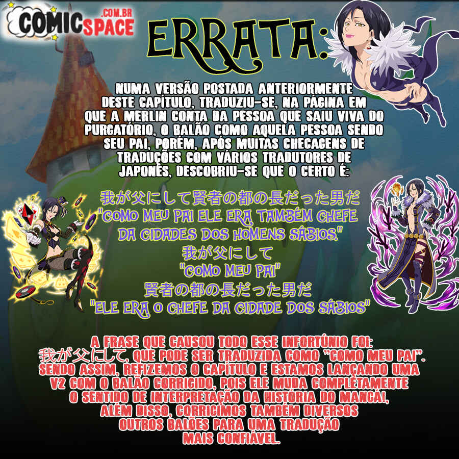 Capítulo 0Capítulo 1 - Os Sete Pecados CapitaisCapítulo 2 - A Espada do PaladinoCapítulo 3 - Algo que Eu Devo FazerCapítulo 4 - O Pecado da Floresta AdormecidaCapítulo 5 - Memória na EscuridãoCapítulo 6 - O Paladino GilthunderCapítulo 7 - O Prisioneiro da EscuridãoCapítulo 8 - O Sonho da GarotaCapítulo 9 - Não Pode Ser TocadoCapítulo 10 - A Maldade InvisívelCapítulo 11 - Mesmo se Você MorrerCapítulo 12 - Uma Festa de ConfusõesCapítulo 13 - Determinação DedicadaCapítulo 14 - ExplosãoCapítulo 15 - O Pequeno EncontroCapítulo 16 - Balada do ComeçoCapítulo 17 - Premonição de TempestadeCapítulo 18 - Reunião TocanteCapítulo 19 - Pecado da GanânciaCapítulo 20 - Dois CaminhosCapítulo 21 - Cavaleiro VingadorCapítulo 22 - Perseguidor TerrívelCapítulo 23 - Algum Dia, DefinitivamenteCapítulo 24 - Lendas EncurraladasCapítulo 25 - Quatro Contra Um, Por FavorCapítulo 26 - Partindo com o MortoCapítulo 27 - A Chuva Sem EmoçõesCapítulo 28 - Homem PerigosoCapítulo 29 - Pulso SombrioCapítulo 30 - Venham! O Festival dos CanalhasCapítulo 31 - Festival de Luta de ByzelCapítulo 32 - Grupo de Lutadores PoderososCapítulo 33 - Previsão de Grande CaosCapítulo 34 - Meliodaz Contra BaanCapítulo 35 - Meliodas RoubadoCapítulo 36 - O Momento de PiscarCapítulo 37 - Se Aproximando da Chance de EncontroCapítulo 38 - Necessidade e AcasoCapítulo 39 - Sentimento de MuitosCapítulo 40 - As Finais do Festival de Luta de ByzelCapítulo 41 - O Choque AssustadorCapítulo 42 - Reator DemônioCapítulo 43 - Aposta PerigosaCapítulo 44 - Contagem Regressiva para o DesesperoCapítulo 45 - Carnaval ViolentoCapítulo 46 - Porque Somos IrmãsCapítulo 47 - Discípulo da DestruiçãoCapítulo 48 - Feliz AniquilaçãoCapítulo 49 - Retirada ForçadaCapítulo 50 - Após o FestivalCapítulo 51 - Profundamente no CoraçãoCapítulo 52 - A Verdade do RumorCapítulo 53 - O Gigante Armado Contra Dawn RoarCapítulo 54 - O Homem que Não se MoveCapítulo 55 - Aquele Homem que Não tem EmoçõesCapítulo 56 - O Cavaleiro ProfanoCapítulo 57 - Acontecimentos de Muito Tempo AtrásCapítulo 58 - Decisão ForçadaCapítulo 59 - Um Homem Imprevisível Entra em CenaCapítulo 60 - Se Metendo em ConfusãoCapítulo 61 - Lendas Não CitadasCapítulo 62 - Vilões ImparáveisCapítulo 63 - Arthur PendragonCapítulo 64 - A Estratégia de Infiltração do Reino!!Capítulo 65 - Um Conflito InevitávelCapítulo 66 - Primeiro InfortúnioCapítulo 67 - FendaCapítulo 68 - Diferença Esmagadora de PoderCapítulo 69 - Todo Mundo Tem uma Primeira VezCapítulo 70 - Grande Paladino AtormentadoCapítulo 71 - Aquilo que Vive na EscuridãoCapítulo 72 - O Homem que Estava Muito AtrasadoCapítulo 73 - Mesmo que Eu Tenha que Destruir Minha VidaCapítulo 74 - A Promessa CumpridaCapítulo 75 - O Que Faz um ReiCapítulo 76 - As Convicções das PrincesasCapítulo 77 - Sentimentos por ElaCapítulo 78 - Em Troca da Minha VidaCapítulo 79 - Mais Uma VezCapítulo 80 - Virando a MesaCapítulo 81 - Único Ataque do MeliodasCapítulo 82 - Feitiço da CoragemCapítulo 83 - Porco CarmesimCapítulo 84 - Tudo Está Bem Quando Termina BemCapítulo 85 - O Começo da FestaCapítulo 86 - Ameaça IminenteCapítulo 87 - A Fúria e a GanânciaCapítulo 88 - Esse Mundo é Como um InfernoCapítulo 89 - Desejo SinceroCapítulo 90 - O Que eu Posso Fazer Por VocêCapítulo 91 - Existência DetestávelCapítulo 92 - A Luta Final ComeçaCapítulo 93 - Vermelho e CinzaCapítulo 94 - Caindo em DesesperoCapítulo 95 - Esperança que DesvaneceCapítulo 96 - HawkCapítulo 97 - ElizabethCapítulo 98 - PreceCapítulo 99 - ConclusãoCapítulo 100 - Os HeróisCapítulo 101 - O Poder do AmorCapítulo 102 - Premonição de um AdeusCapítulo 103 - A Nova JornadaCapítulo 104 - O Retorno do Rei das FadasCapítulo 105 - Um NinguémCapítulo 106 - O Olho Demoníaco de BalorCapítulo 107 - À Procura da VerdadeCapítulo 108 - Despertar GentilCapítulo 109 - TerremotoCapítulo 110 - ConfissãoCapítulo 111 - Como Um Homem DiziaCapítulo 112 - Existência e ProvaCapítulo 113 - RevelaçãoCapítulo 114 - Heróis HesitantesCapítulo 115 - De Volta ao PesadeloCapítulo 116 - O Tesouro Sagrado LostvayneCapítulo 117 - Os Dois Reis das FadasCapítulo 118 - Confronto!! A Floresta do Rei das FadasCapítulo 119 - Os Dez Mandamentos Começam a AgirCapítulo 120 - Violência EsmagadoraCapítulo 121 - Previsão ImpossívelCapítulo 122 - O Massacre dos DemôniosCapítulo 123 - A Redenção do Capitão dos PaladinosCapítulo 124 - O Que a Amizade nos TrouxeCapítulo 125 - Acabem com os "Dez Mandamentos"!!Capítulo 126 - Para Onde as Memórias VãoCapítulo 127 - Reunião com o DesesperoCapítulo 128 - Existência ArroganteCapítulo 129 - A Terra Sagrada dos DruidasCapítulo 130 - A Dor que Gentilmente MataCapítulo 131 - A Promessa Com a Minha AmadaCapítulo 132 - Aquilo que nos FaltaCapítulo 133 - Impaciência e AnsiedadeCapítulo 134 - À Você, Que Não é Mais Meu CapitãoCapítulo 135 - Meras Boas VindasCapítulo 136 - Disseminando o MedoCapítulo 137 - Aqui Entre Eu e VocêCapítulo 138 - Batalha Contra as TrevasCapítulo 139 - Conte-me Sobre o Seu PassadoCapítulo 140 - O Ladrão e o GarotoCapítulo 141 - Pai e FilhoCapítulo 142 - Onde o Amor EstáCapítulo 143 - O Grito da Donzela SagradaCapítulo 144 - Aquele Homem da "Ganância"Capítulo 145 - Bela AlmaCapítulo 146 - Adeus, Meu Amado LadrãoCapítulo 147 - Perseguição MortalCapítulo 148 - Galan GameCapítulo 149 - A Magia de GalanCapítulo 150 - Mestre do SolCapítulo 151 - O Palco Espera por NósCapítulo 152 - Atraídos pela Luz da VelaCapítulo 153 - A Confissão AterrorizanteCapítulo 154 - O Diabo SorriCapítulo 155 - Labirinto da Armadilha da MorteCapítulo 156 - Desafio de Exploração do LabirintoCapítulo 157 - A Dança Caótica dos DesafiantesCapítulo 158 - Os Heróis da FoliaCapítulo 159 - Palavras Não São NecessáriasCapítulo 160 - Vão!! SuperemCapítulo 161 - Aqueles da LendaCapítulo 162 -