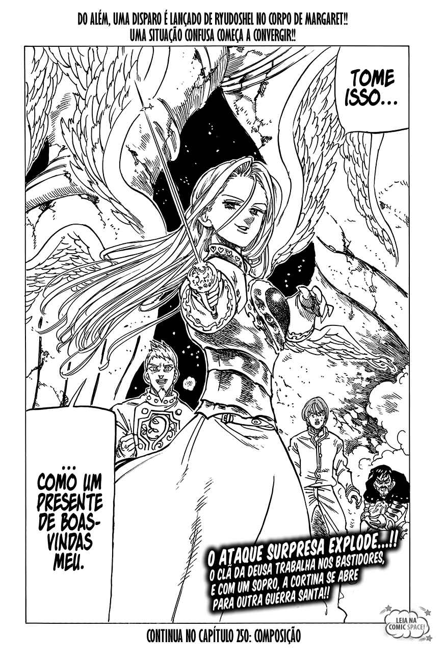 Capítulo 0Capítulo 1 - Os Sete Pecados CapitaisCapítulo 2 - A Espada do PaladinoCapítulo 3 - Algo que Eu Devo FazerCapítulo 4 - O Pecado da Floresta AdormecidaCapítulo 5 - Memória na EscuridãoCapítulo 6 - O Paladino GilthunderCapítulo 7 - O Prisioneiro da EscuridãoCapítulo 8 - O Sonho da GarotaCapítulo 9 - Não Pode Ser TocadoCapítulo 10 - A Maldade InvisívelCapítulo 11 - Mesmo se Você MorrerCapítulo 12 - Uma Festa de ConfusõesCapítulo 13 - Determinação DedicadaCapítulo 14 - ExplosãoCapítulo 15 - O Pequeno EncontroCapítulo 16 - Balada do ComeçoCapítulo 17 - Premonição de TempestadeCapítulo 18 - Reunião TocanteCapítulo 19 - Pecado da GanânciaCapítulo 20 - Dois CaminhosCapítulo 21 - Cavaleiro VingadorCapítulo 22 - Perseguidor TerrívelCapítulo 23 - Algum Dia, DefinitivamenteCapítulo 24 - Lendas EncurraladasCapítulo 25 - Quatro Contra Um, Por FavorCapítulo 26 - Partindo com o MortoCapítulo 27 - A Chuva Sem EmoçõesCapítulo 28 - Homem PerigosoCapítulo 29 - Pulso SombrioCapítulo 30 - Venham! O Festival dos CanalhasCapítulo 31 - Festival de Luta de ByzelCapítulo 32 - Grupo de Lutadores PoderososCapítulo 33 - Previsão de Grande CaosCapítulo 34 - Meliodaz Contra BaanCapítulo 35 - Meliodas RoubadoCapítulo 36 - O Momento de PiscarCapítulo 37 - Se Aproximando da Chance de EncontroCapítulo 38 - Necessidade e AcasoCapítulo 39 - Sentimento de MuitosCapítulo 40 - As Finais do Festival de Luta de ByzelCapítulo 41 - O Choque AssustadorCapítulo 42 - Reator DemônioCapítulo 43 - Aposta PerigosaCapítulo 44 - Contagem Regressiva para o DesesperoCapítulo 45 - Carnaval ViolentoCapítulo 46 - Porque Somos IrmãsCapítulo 47 - Discípulo da DestruiçãoCapítulo 48 - Feliz AniquilaçãoCapítulo 49 - Retirada ForçadaCapítulo 50 - Após o FestivalCapítulo 51 - Profundamente no CoraçãoCapítulo 52 - A Verdade do RumorCapítulo 53 - O Gigante Armado Contra Dawn RoarCapítulo 54 - O Homem que Não se MoveCapítulo 55 - Aquele Homem que Não tem EmoçõesCapítulo 56 - O Cavaleiro ProfanoCapítulo 57 - Acontecimentos de Muito Tempo AtrásCapítulo 58 - Decisão ForçadaCapítulo 59 - Um Homem Imprevisível Entra em CenaCapítulo 60 - Se Metendo em ConfusãoCapítulo 61 - Lendas Não CitadasCapítulo 62 - Vilões ImparáveisCapítulo 63 - Arthur PendragonCapítulo 64 - A Estratégia de Infiltração do Reino!!Capítulo 65 - Um Conflito InevitávelCapítulo 66 - Primeiro InfortúnioCapítulo 67 - FendaCapítulo 68 - Diferença Esmagadora de PoderCapítulo 69 - Todo Mundo Tem uma Primeira VezCapítulo 70 - Grande Paladino AtormentadoCapítulo 71 - Aquilo que Vive na EscuridãoCapítulo 72 - O Homem que Estava Muito AtrasadoCapítulo 73 - Mesmo que Eu Tenha que Destruir Minha VidaCapítulo 74 - A Promessa CumpridaCapítulo 75 - O Que Faz um ReiCapítulo 76 - As Convicções das PrincesasCapítulo 77 - Sentimentos por ElaCapítulo 78 - Em Troca da Minha VidaCapítulo 79 - Mais Uma VezCapítulo 80 - Virando a MesaCapítulo 81 - Único Ataque do MeliodasCapítulo 82 - Feitiço da CoragemCapítulo 83 - Porco CarmesimCapítulo 84 - Tudo Está Bem Quando Termina BemCapítulo 85 - O Começo da FestaCapítulo 86 - Ameaça IminenteCapítulo 87 - A Fúria e a GanânciaCapítulo 88 - Esse Mundo é Como um InfernoCapítulo 89 - Desejo SinceroCapítulo 90 - O Que eu Posso Fazer Por VocêCapítulo 91 - Existência DetestávelCapítulo 92 - A Luta Final ComeçaCapítulo 93 - Vermelho e CinzaCapítulo 94 - Caindo em DesesperoCapítulo 95 - Esperança que DesvaneceCapítulo 96 - HawkCapítulo 97 - ElizabethCapítulo 98 - PreceCapítulo 99 - ConclusãoCapítulo 100 - Os HeróisCapítulo 101 - O Poder do AmorCapítulo 102 - Premonição de um AdeusCapítulo 103 - A Nova JornadaCapítulo 104 - O Retorno do Rei das FadasCapítulo 105 - Um NinguémCapítulo 106 - O Olho Demoníaco de BalorCapítulo 107 - À Procura da VerdadeCapítulo 108 - Despertar GentilCapítulo 109 - TerremotoCapítulo 110 - ConfissãoCapítulo 111 - Como Um Homem DiziaCapítulo 112 - Existência e ProvaCapítulo 113 - RevelaçãoCapítulo 114 - Heróis HesitantesCapítulo 115 - De Volta ao PesadeloCapítulo 116 - O Tesouro Sagrado LostvayneCapítulo 117 - Os Dois Reis das FadasCapítulo 118 - Confronto!! A Floresta do Rei das FadasCapítulo 119 - Os Dez Mandamentos Começam a AgirCapítulo 120 - Violência EsmagadoraCapítulo 121 - Previsão ImpossívelCapítulo 122 - O Massacre dos DemôniosCapítulo 123 - A Redenção do Capitão dos PaladinosCapítulo 124 - O Que a Amizade nos TrouxeCapítulo 125 - Acabem com os "Dez Mandamentos"!!Capítulo 126 - Para Onde as Memórias VãoCapítulo 127 - Reunião com o DesesperoCapítulo 128 - Existência ArroganteCapítulo 129 - A Terra Sagrada dos DruidasCapítulo 130 - A Dor que Gentilmente MataCapítulo 131 - A Promessa Com a Minha AmadaCapítulo 132 - Aquilo que nos FaltaCapítulo 133 - Impaciência e AnsiedadeCapítulo 134 - À Você, Que Não é Mais Meu CapitãoCapítulo 135 - Meras Boas VindasCapítulo 136 - Disseminando o MedoCapítulo 137 - Aqui Entre Eu e VocêCapítulo 138 - Batalha Contra as TrevasCapítulo 139 - Conte-me Sobre o Seu PassadoCapítulo 140 - O Ladrão e o GarotoCapítulo 141 - Pai e FilhoCapítulo 142 - Onde o Amor EstáCapítulo 143 - O Grito da Donzela SagradaCapítulo 144 - Aquele Homem da "Ganância"Capítulo 145 - Bela AlmaCapítulo 146 - Adeus, Meu Amado LadrãoCapítulo 147 - Perseguição MortalCapítulo 148 - Galan GameCapítulo 149 - A Magia de GalanCapítulo 150 - Mestre do SolCapítulo 151 - O Palco Espera por NósCapítulo 152 - Atraídos pela Luz da VelaCapítulo 153 - A Confissão AterrorizanteCapítulo 154 - O Diabo SorriCapítulo 155 - Labirinto da Armadilha da MorteCapítulo 156 - Desafio de Exploração do LabirintoCapítulo 157 - A Dança Caótica dos DesafiantesCapítulo 158 - Os Heróis da FoliaCapítulo 159 - Palavras Não São NecessáriasCapítulo 160 - Vão!! SuperemCapítulo 161 - Aqueles da LendaCapítulo 162 -