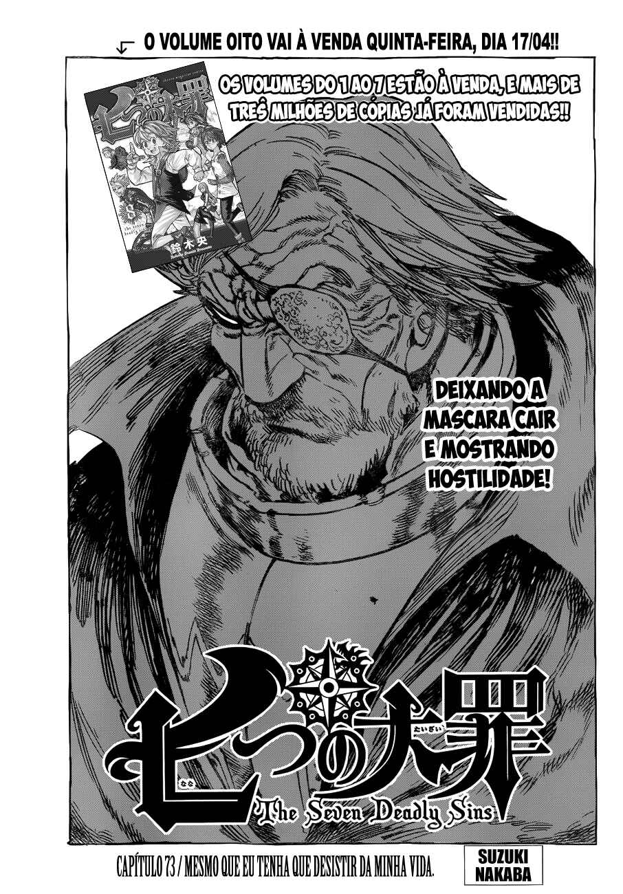 Capítulo 0Capítulo 1 - Os Sete Pecados CapitaisCapítulo 2 - A Espada do PaladinoCapítulo 3 - Algo que Eu Devo FazerCapítulo 4 - O Pecado da Floresta AdormecidaCapítulo 5 - Memória na EscuridãoCapítulo 6 - O Paladino GilthunderCapítulo 7 - O Prisioneiro da EscuridãoCapítulo 8 - O Sonho da GarotaCapítulo 9 - Não Pode Ser TocadoCapítulo 10 - A Maldade InvisívelCapítulo 11 - Mesmo se Você MorrerCapítulo 12 - Uma Festa de ConfusõesCapítulo 13 - Determinação DedicadaCapítulo 14 - ExplosãoCapítulo 15 - O Pequeno EncontroCapítulo 16 - Balada do ComeçoCapítulo 17 - Premonição de TempestadeCapítulo 18 - Reunião TocanteCapítulo 19 - Pecado da GanânciaCapítulo 20 - Dois CaminhosCapítulo 21 - Cavaleiro VingadorCapítulo 22 - Perseguidor TerrívelCapítulo 23 - Algum Dia, DefinitivamenteCapítulo 24 - Lendas EncurraladasCapítulo 25 - Quatro Contra Um, Por FavorCapítulo 26 - Partindo com o MortoCapítulo 27 - A Chuva Sem EmoçõesCapítulo 28 - Homem PerigosoCapítulo 29 - Pulso SombrioCapítulo 30 - Venham! O Festival dos CanalhasCapítulo 31 - Festival de Luta de ByzelCapítulo 32 - Grupo de Lutadores PoderososCapítulo 33 - Previsão de Grande CaosCapítulo 34 - Meliodaz Contra BaanCapítulo 35 - Meliodas RoubadoCapítulo 36 - O Momento de PiscarCapítulo 37 - Se Aproximando da Chance de EncontroCapítulo 38 - Necessidade e AcasoCapítulo 39 - Sentimento de MuitosCapítulo 40 - As Finais do Festival de Luta de ByzelCapítulo 41 - O Choque AssustadorCapítulo 42 - Reator DemônioCapítulo 43 - Aposta PerigosaCapítulo 44 - Contagem Regressiva para o DesesperoCapítulo 45 - Carnaval ViolentoCapítulo 46 - Porque Somos IrmãsCapítulo 47 - Discípulo da DestruiçãoCapítulo 48 - Feliz AniquilaçãoCapítulo 49 - Retirada ForçadaCapítulo 50 - Após o FestivalCapítulo 51 - Profundamente no CoraçãoCapítulo 52 - A Verdade do RumorCapítulo 53 - O Gigante Armado Contra Dawn RoarCapítulo 54 - O Homem que Não se MoveCapítulo 55 - Aquele Homem que Não tem EmoçõesCapítulo 56 - O Cavaleiro ProfanoCapítulo 57 - Acontecimentos de Muito Tempo AtrásCapítulo 58 - Decisão ForçadaCapítulo 59 - Um Homem Imprevisível Entra em CenaCapítulo 60 - Se Metendo em ConfusãoCapítulo 61 - Lendas Não CitadasCapítulo 62 - Vilões ImparáveisCapítulo 63 - Arthur PendragonCapítulo 64 - A Estratégia de Infiltração do Reino!!Capítulo 65 - Um Conflito InevitávelCapítulo 66 - Primeiro InfortúnioCapítulo 67 - FendaCapítulo 68 - Diferença Esmagadora de PoderCapítulo 69 - Todo Mundo Tem uma Primeira VezCapítulo 70 - Grande Paladino AtormentadoCapítulo 71 - Aquilo que Vive na EscuridãoCapítulo 72 - O Homem que Estava Muito AtrasadoCapítulo 73 - Mesmo que Eu Tenha que Destruir Minha VidaCapítulo 74 - A Promessa CumpridaCapítulo 75 - O Que Faz um ReiCapítulo 76 - As Convicções das PrincesasCapítulo 77 - Sentimentos por ElaCapítulo 78 - Em Troca da Minha VidaCapítulo 79 - Mais Uma VezCapítulo 80 - Virando a MesaCapítulo 81 - Único Ataque do MeliodasCapítulo 82 - Feitiço da CoragemCapítulo 83 - Porco CarmesimCapítulo 84 - Tudo Está Bem Quando Termina BemCapítulo 85 - O Começo da FestaCapítulo 86 - Ameaça IminenteCapítulo 87 - A Fúria e a GanânciaCapítulo 88 - Esse Mundo é Como um InfernoCapítulo 89 - Desejo SinceroCapítulo 90 - O Que eu Posso Fazer Por VocêCapítulo 91 - Existência DetestávelCapítulo 92 - A Luta Final ComeçaCapítulo 93 - Vermelho e CinzaCapítulo 94 - Caindo em DesesperoCapítulo 95 - Esperança que DesvaneceCapítulo 96 - HawkCapítulo 97 - ElizabethCapítulo 98 - PreceCapítulo 99 - ConclusãoCapítulo 100 - Os HeróisCapítulo 101 - O Poder do AmorCapítulo 102 - Premonição de um AdeusCapítulo 103 - A Nova JornadaCapítulo 104 - O Retorno do Rei das FadasCapítulo 105 - Um NinguémCapítulo 106 - O Olho Demoníaco de BalorCapítulo 107 - À Procura da VerdadeCapítulo 108 - Despertar GentilCapítulo 109 - TerremotoCapítulo 110 - ConfissãoCapítulo 111 - Como Um Homem DiziaCapítulo 112 - Existência e ProvaCapítulo 113 - RevelaçãoCapítulo 114 - Heróis HesitantesCapítulo 115 - De Volta ao PesadeloCapítulo 116 - O Tesouro Sagrado LostvayneCapítulo 117 - Os Dois Reis das FadasCapítulo 118 - Confronto!! A Floresta do Rei das FadasCapítulo 119 - Os Dez Mandamentos Começam a AgirCapítulo 120 - Violência EsmagadoraCapítulo 121 - Previsão ImpossívelCapítulo 122 - O Massacre dos DemôniosCapítulo 123 - A Redenção do Capitão dos PaladinosCapítulo 124 - O Que a Amizade nos TrouxeCapítulo 125 - Acabem com os "Dez Mandamentos"!!Capítulo 126 - Para Onde as Memórias VãoCapítulo 127 - Reunião com o DesesperoCapítulo 128 - Existência ArroganteCapítulo 129 - A Terra Sagrada dos DruidasCapítulo 130 - A Dor que Gentilmente MataCapítulo 131 - A Promessa Com a Minha AmadaCapítulo 132 - Aquilo que nos FaltaCapítulo 133 - Impaciência e AnsiedadeCapítulo 134 - À Você, Que Não é Mais Meu CapitãoCapítulo 135 - Meras Boas VindasCapítulo 136 - Disseminando o MedoCapítulo 137 - Aqui Entre Eu e VocêCapítulo 138 - Batalha Contra as TrevasCapítulo 139 - Conte-me Sobre o Seu PassadoCapítulo 140 - O Ladrão e o GarotoCapítulo 141 - Pai e FilhoCapítulo 142 - Onde o Amor EstáCapítulo 143 - O Grito da Donzela SagradaCapítulo 144 - Aquele Homem da "Ganância"Capítulo 145 - Bela AlmaCapítulo 146 - Adeus, Meu Amado LadrãoCapítulo 147 - Perseguição MortalCapítulo 148 - Galan GameCapítulo 149 - A Magia de GalanCapítulo 150 - Mestre do SolCapítulo 151 - O Palco Espera por NósCapítulo 152 - Atraídos pela Luz da VelaCapítulo 153 - A Confissão AterrorizanteCapítulo 154 - O Diabo SorriCapítulo 155 - Labirinto da Armadilha da MorteCapítulo 156 - Desafio de Exploração do LabirintoCapítulo 157 - A Dança Caótica dos DesafiantesCapítulo 158 - Os Heróis da FoliaCapítulo 159 - Palavras Não São NecessáriasCapítulo 160 - Vão!! SuperemCapítulo 161 - Aqueles da LendaCapítulo 162 -