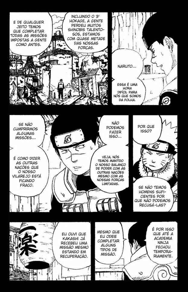 Capítulo 1 - Uzumaki Naruto!!Capítulo 2 - KonohamaruCapítulo 2 - Konohamaru!!Capítulo 3 - Sasuke Aparece!Capítulo 3 - Uchiha Sasuke!!Capítulo 4 - Hatake Kakashi!!Capítulo 5 - A Soberba Precede a Queda!Capítulo 6 - Com o Sasuke, Não!!Capítulo 7 - A Conclusão do KakashiCapítulo 8 - Mesmo Assim Vocês Falharam!!Capítulo 8 - Vocês ReprovaramCapítulo 9 - O Cliente Mais ChatoCapítulo 9 - O Pior Cliente PossívelCapítulo 10 - Menos DoisCapítulo 10 - 2 Já ForamCapítulo 11 - Desembarque...!!Capítulo 11 - DesembarcandoCapítulo 12 - Acabou Pra Você!Capítulo 12 - Está Acabado!!Capítulo 13 - NinjaCapítulo 14 - O Plano Secreto!!!Capítulo 15 - Sharingan Ressuscitado!!Capítulo 16 - Você É!!Capítulo 17 - Preparando-se para a Batalha!!Capítulo 18 - O Treinamento ComeçaCapítulo 19 - Símbolo de CoragemCapítulo 20 - O País que Tinha um Herói...!!Capítulo 21 - Encontro na Floresta...!!Capítulo 22 - Aparece um Rival!!Capítulo 23 - 2 Ataques Surpresa...!!Capítulo 24 - Agilidade!!Capítulo 25 - Pelo Bem dos Sonhos...!!Capítulo 26 - Sharingan Esmigalhado...!!Capítulo 27 - O Despertar....!!Capítulo 28 - Kyuubi...!!Capítulo 29 - Uma Pessoa Importante...!!Capítulo 30 - Seu Futuro é...!!Capítulo 31 - Suas Próprias Batalhas...!!Capítulo 32 - Uma Ferramenta Chamada ShinobiCapítulo 33 - A Ponte de Heróis!!Capítulo 34 - Intrusos!?Capítulo 35 - Iruka VS Kakashi!?Capítulo 36 - A Depressão de Sakura!!Capítulo 37 - O Pior Parte para Cima...!!Capítulo 38 - Começa...!!Capítulo 39 - Desafiadores!!Capítulo 40 - O Primeiro Teste!!Capítulo 41 - O Sussurro do Demônio...!?Capítulo 42 - A Batalha de Cada um...!!Capítulo 43 - A Décima Questão...!!Capítulo 44 - Habilidade Testada...!!Capítulo 45 - O Segundo Teste!!Capítulo 46 - O Código é...!!Capítulo 47 - Predador!!Capítulo 48 - O Propósito é...!!Capítulo 49 - Covarde...!!Capítulo 50 - Eu Devo...!!Capítulo 51 - A Besta Bonita...!!Capítulo 52 - Condição de Uso!!Capítulo 53 - A Decisão de Sakura!!Capítulo 54 - Sakura e InoCapítulo 55 - A Guerra de Todos...!!Capítulo 56 - Poder Conhecido...!!Capítulo 57 - 10 Horas Mais CedoCapítulo 58 - Testemunhas...!!Capítulo 59 - Tragédia na Areia!!Capítulo 60 - Última Chance...!!Capítulo 61 - O Caminho a Ser Seguido...!!Capítulo 62 - Encurralados como Ratos...!!Capítulo 63 - A Outra FaceCapítulo 64 - A Mensagem do Hokage...!!Capítulo 65 - Batalha Pela Vida!!Capítulo 66 - O Pedido de SakuraCapítulo 67 - Habilidade Oposta!!Capítulo 68 - O Sangue Uchiha!!Capítulo 69 - O Visitante Assustador!!Capítulo 70 - Aquele que Irá Morrer é...!?Capítulo 71 - Uma Parede Muito Alta...!!Capítulo 72 - Rivalidade...!!Capítulo 73 - Anúncio de Derrota...!?Capítulo 74 - A Sexta Luta... e Então!!Capítulo 75 - O Crescimento de Naruto...!!Capítulo 76 - O Contre-Ataque de Kiba!! O Contra-Ataque de Naruto!!?Capítulo 77 - O Truque de Naruto!!Capítulo 78 - Neji e HinataCapítulo 79 - O Clã HyuugaCapítulo 80 - Ultrapassar o Limite...Capítulo 81 - Gaara VS...Capítulo 82 - O Segredo de Lee!!Capítulo 83 - A Defesa Absoluta Desmoronou!?Capítulo 84 - O Gênio do Trabalho Duro...!!Capítulo 85 - Agora...!!Capítulo 86 - Um Ninja Esplêndido...!!Capítulo 87 - Preliminares Concluídas...!!Capítulo 88 - Onde Está Sasuke...!?Capítulo 89 - O Pedido de Naruto...!!Capítulo 90 - E o Treinamento!?Capítulo 91 - A Aplicação do Discípulo!?Capítulo 92 - Folha e Som e Areia e...!!Capítulo 93 - A Paixão... de Cada um!!Capítulo 94 - A Chave...!!Capítulo 95 - A Reunião...!!Capítulo 96 - O Intruso Imprevisto!!Capítulo 97 - Razão para Existir...!!Capítulo 98 - Uma Falha Orgulhosa!!Capítulo 99 - O Evento Principal Começa...!!Capítulo 100 - Preparado para Morrer...!!Capítulo 101 - O Outro...!!Capítulo 102 - O Pássaro Engaiolado...!!Capítulo 103 - Perdedor!!Capítulo 104 - O Poder para Mudar...!!Capítulo 105 - O Grande Vôo!!Capítulo 106 - Sasuke Falha...!?Capítulo 107 - O Garoto sem Espírito de Luta!!Capítulo 108 - Premonição de Vitória...!?Capítulo 109 - A Dança da Folha...!!Capítulo 110 - Finalmente...!!Capítulo 111 - Sasuke VS Gaara!!Capítulo 112 - O Taijutsu do Sasuke...!!Capítulo 113 - Razão para o Atraso...!!Capítulo 114 - Ataque...!!Capítulo 115 - Exame Chuunin, Conclusão...!!Capítulo 116 - O Desmoronamento da Folha...!!Capítulo 117 - A Missão Determinada...!!Capítulo 118 - Atrasando...!!Capítulo 119 - O Plano da Isca...!!Capítulo 120 - Hokage VS Hokage!!Capítulo 121 - Experiêcia Terrível...!!Capítulo 122 - O Herdeiro da Determinação!!Capítulo 123 - O Selamento FinalCapítulo 124 - A Batalha Eterna...!!Capítulo 125 - O Despertar...!!Capítulo 126 - Descuidado...!!Capítulo 127 - Sentindo-se Vivo...!!Capítulo 128 - Além dos Limites...!!Capítulo 129 - Dor...!!Capítulo 130 - Amor...!!Capítulo 131 - Um Nome Chamado Gaara...!!Capítulo 132 - Os Dois... Escuridão e LuzCapítulo 133 - Caras Fortes...!!Capítulo 134 - Manual Ninja do Naruto!!Capítulo 135 - Luta Tempestuosa!!!Capítulo 136 - O Golpe Final...!!Capítulo 137 - O Shinobi da Folha...!!Capítulo 138 - Desmoronamento da Folha, Fim!!Capítulo 139 - O Nome dessa Pessoa é...!!Capítulo 140 - Contato...!!Capítulo 141 - Uchiha Itachi!!Capítulo 142 - Kakashi VS ItachiCapítulo 143 - O Legado do Yondaime!!Capítulo 144 - Os PerseguidoresCapítulo 145 - Memória do DesesperoCapítulo 146 - Junto com o Ódio...!!Capítulo 147 - É Minha Luta!!Capítulo 148 - O Poder de Itachi!!Capítulo 149 - A Lendária...!!Capítulo 150 - Começo do Treinamento...!?Capítulo 151 - Chance...!!Capítulo 152 - Segundo EstágioCapítulo 153 - Exploradores!!Capítulo 154 - Chegada...!!Capítulo 155 - Terceiro EstágioCapítulo 156 - A OfertaCapítulo 157 - A Resposta é...!?Capítulo 158 - Não te Esquecerei...!!Capítulo 159 - A Aposta...!!Capítulo 160 - O Colar da Morte...!!Capítulo 161 - A Decisão da Tsunade!!Capítulo 162 - Coração Vulnerável...!!Capítulo 163 - Aquele que se Rec