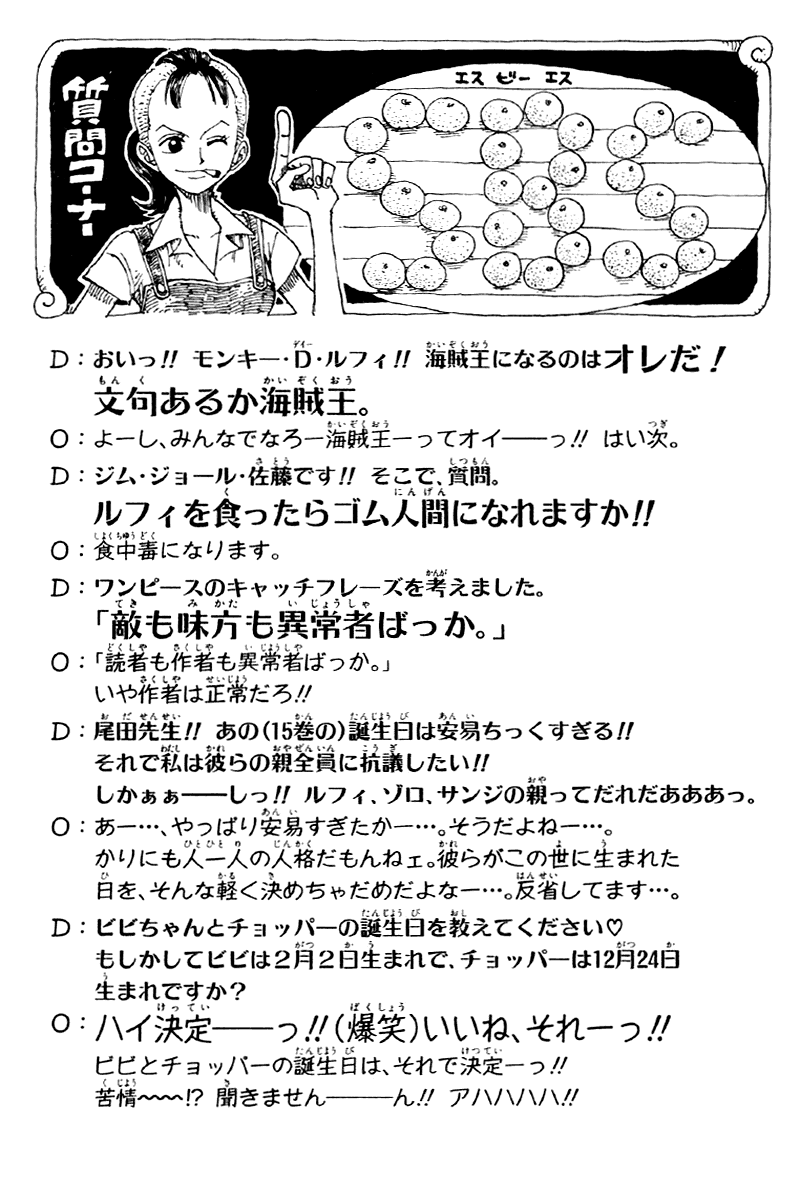 Capítulo 1 - Romance DawnCapítulo 1 - Romance Dawn ~O Alvorecer da Aventura~Capítulo 2 - O Garoto "Luffy do Chapéu de Palha"Capítulo 3 - Surge Zoro, o Caçador de PiratasCapítulo 3 - Zoro, O Caçador de PiratasCapítulo 4 - O Capitão da Marinha "Morgan Braço de Machado"Capítulo 5 - O Rei dos Piratas e o Melhor EspadachimCapítulo 6 - O Primeiro do BandoCapítulo 7 - AmigosCapítulo 8 - Apresentando NamiCapítulo 9 - Mulher DiabólicaCapítulo 10 - Incidente na TavernaCapítulo 11 - VôoCapítulo 12 - CãoCapítulo 13 - TesouroCapítulo 14 - Imprudência!!Capítulo 15 - GongoCapítulo 16 - Contra!! O Bando Pirata do BuggyCapítulo 17 - AvaliaçãoCapítulo 18 - O Pirata "Buggy, o Palhaço"Capítulo 19 - Akuma no MiCapítulo 20 - A Filosofia da LadraCapítulo 21 - CidadãosCapítulo 22 - Você é um Espécime RaroCapítulo 23 - Apresentando Capitão UsoppCapítulo 24 - Coisas Que Não se Pode MentirCapítulo 25 - 800 MentirasCapítulo 26 - O Plano do Capitão KuroCapítulo 27 - PlanoCapítulo 28 - Lua CrescenteCapítulo 29 - A LadeiraCapítulo 30 - Excelente!!!Capítulo 31 - A VerdadeCapítulo 32 - Grande InfortúnioCapítulo 33 - O Homem SorrateiroCapítulo 34 - O Mordomo KlahadorCapítulo 35 - Ladeira ÍngremeCapítulo 36 - Perseguição!!Capítulo 37 - O Pirata "Kuro dos Mil Truques"Capítulo 38 - O Bando PirataCapítulo 39 - Para Quem o Sino TocaCapítulo 40 - O Bando Pirata do UsoppCapítulo 41 - Para o MarCapítulo 42 - Yosaku e JohnnyCapítulo 43 - Apresentando SanjiCapítulo 44 - Os Três CozinheirosCapítulo 45 - Antes da TempestadeCapítulo 46 - Convidado InesperadoCapítulo 47 - Almirante da Frota Pirata, "Don Krieg"Capítulo 48 - Não Vá Para Aquela RotaCapítulo 49 - TempestadeCapítulo 50 - Meu Próprio DestinoCapítulo 51 - Roronoa Zoro Cai no MarCapítulo 52 - JuramentoCapítulo 53 - Peixe Pequeno Nº 1Capítulo 54 - Pearl-sanCapítulo 55 - Floresta SangrentaCapítulo 56 - De Jeito NenhumCapítulo 57 - Por Trás do SonhoCapítulo 58 - Velho de MerdaCapítulo 59 - DívidaCapítulo 60 - Pagando a DívidaCapítulo 61 - DemônioCapítulo 62 - MH5Capítulo 63 - Não Vou MorrerCapítulo 64 - A Arma SupremaCapítulo 65 - Prepare-seCapítulo 66 - A Lança é DestruídaCapítulo 67 - SopaCapítulo 68 - O Quarto do BandoCapítulo 69 - Arlong ParkCapítulo 70 - A Grande Aventura do Homem UsoppCapítulo 71 - O Senhor da CriaçãoCapítulo 72 - Vivendo AdequadamenteCapítulo 73 - O Monstro Vindo da Grand LineCapítulo 74 - NegóciosCapítulo 75 - Mapas e TritõesCapítulo 76 - DormirCapítulo 77 - O Primeiro Passo do SonhoCapítulo 78 - Bellemère-sanCapítulo 79 - ViverCapítulo 80 - Uma Ladra é uma LadraCapítulo 81 - LágrimasCapítulo 82 - Certo, Vamos LEVANTAR!Capítulo 83 - Luffy de PretoCapítulo 84 - ZumbiCapítulo 85 - Santouryuu Contra RokutouryuuCapítulo 86 - Heroísmo VS Karate TritãoCapítulo 87 - Acabou!!Capítulo 88 - Morra!!!Capítulo 89 - TrocaCapítulo 90 - O Que Você Pode Fazer?Capítulo 91 - DardosCapítulo 92 - FelicidadeCapítulo 93 - DemolindoCapítulo 94 - A Segunda do BandoCapítulo 95 - Gire Cata-ventoCapítulo 96 - O Pior Homem do LesteCapítulo 97 - Kitetsu TerceiraCapítulo 98 - Nunvens NegrasCapítulo 99 - Luffy é MortoCapítulo 100 - O Início de uma LendaCapítulo 101 - Reverse MountainCapítulo 102 - Agora, a Grand LineCapítulo 103 - BaleiaCapítulo 104 - O Cabo da PromessaCapítulo 105 - Log PoseCapítulo 106 - A Cidade HospitaleiraCapítulo 107 - Luar e SepulturasCapítulo 108 - 100 Caçadores de RecompensasCapítulo 109 - Problemas de ResponsabilidadeCapítulo 110 - Noite Sem FimCapítulo 111 - Sindicato Secreto de CrimesCapítulo 112 - ZoroCapítulo 113 - Está Tudo Bem!!!Capítulo 114 - RotaCapítulo 115 - Aventura em Little GardenCapítulo 116 - GigantesCapítulo 117 - BrogyCapítulo 118 - Há Alguém AquiCapítulo 119 - Golpe BaixoCapítulo 120 - O Ogro Vermelho ChoraCapítulo 121 - Eu SabiaCapítulo 122 - Um Peso Morto Não AjudaCapítulo 123 - Mr. 3Capítulo 124 - Maldito Chá DeliciosoCapítulo 125 - Candle ChampionCapítulo 126 - InstintoCapítulo 127 - Denden-mushiCapítulo 128 - Orgulho PirataCapítulo 129 - Seguir em Frente!!!Capítulo 130 - Velocidade MáximaCapítulo 131 - Wapol, o BlikCapítulo 132 - Vê?Capítulo 133 - Aventura no País Sem NomeCapítulo 134 - Dra. KurehaCapítulo 135 - LapahnCapítulo 136 - O Homem Chamado DoltonCapítulo 137 - AvalancheCapítulo 138 - TopoCapítulo 139 - Apresentando Tony Tony ChopperCapítulo 140 - Vivendo num Castelo de NeveCapítulo 141 - CurandeiroCapítulo 142 - Caveira e Flores de CerejeiraCapítulo 143 - DesajeitadoCapítulo 144 - Um Conto de InvernoCapítulo 145 - Determinação HerdadaCapítulo 146 - Batalha para Defender o PaísCapítulo 147 - FraudeCapítulo 148 - IndestrutívelCapítulo 149 - Estrondo!!Capítulo 150 - O Canhão Bliking de 7 Tiros da Coroa Real de DrumCapítulo 151 - O Céu de DrumCapítulo 152 - Lua CheiaCapítulo 153 - As Flores de Cerejeira do HirulukCapítulo 154 - Para AlabastaCapítulo 155 - O Pirata Sir CrocodileCapítulo 156 - Clima OkamaCapítulo 157 - Apresentando AceCapítulo 158 - Desembracando em AlabastaCapítulo 159 - VenhaCapítulo 160 - 8:00 pm no Spiders CaféCapítulo 161 - Erumalu, a Cidade VerdeCapítulo 162 - Aventura no País DesérticoCapítulo 163 - Yuba, a Cidade da Armada RebeldeCapítulo 164 - Eu Amo Esse PaísCapítulo 165 - Operação: UtopiaCapítulo 166 - Luffy VS ViviCapítulo 167 - Linha de FrenteCapítulo 168 - Rainbase, a Cidade dos SonhosCapítulo 169 - O Guerreiro Mais Forte do ReinoCapítulo 170 - ComeçaCapítulo 171 - Koza, o Líder da Armada RebeldeCapítulo 172 - RebeliãoCapítulo 173 - Crocodilos-bananaCapítulo 174 - Mr. PríncipeCapítulo 175 - LibertaçãoCapítulo 176 - Corram!!Capítulo 177 - 30 Milhões VS 81 MilhõesCapítulo 178 - Nível G. L.Capítulo 179 - Batalha Decisiva em AlubarnaCapítulo 180 - A Fauna de AlabastaCapítulo 181 - O Quiz dos Super Patos-de-Bico-ListradoCapítulo 182 - RugidoCapítulo 