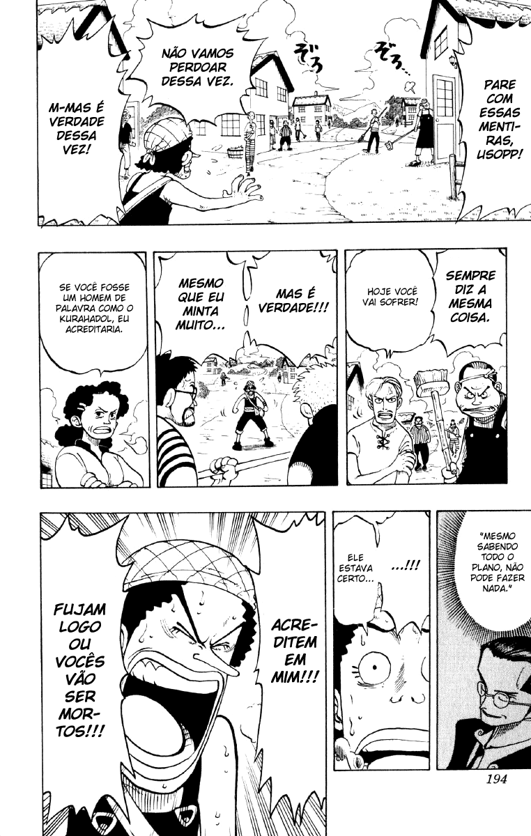 Capítulo 1 - Romance DawnCapítulo 1 - Romance Dawn ~O Alvorecer da Aventura~Capítulo 2 - O Garoto "Luffy do Chapéu de Palha"Capítulo 3 - Surge Zoro, o Caçador de PiratasCapítulo 3 - Zoro, O Caçador de PiratasCapítulo 4 - O Capitão da Marinha "Morgan Braço de Machado"Capítulo 5 - O Rei dos Piratas e o Melhor EspadachimCapítulo 6 - O Primeiro do BandoCapítulo 7 - AmigosCapítulo 8 - Apresentando NamiCapítulo 9 - Mulher DiabólicaCapítulo 10 - Incidente na TavernaCapítulo 11 - VôoCapítulo 12 - CãoCapítulo 13 - TesouroCapítulo 14 - Imprudência!!Capítulo 15 - GongoCapítulo 16 - Contra!! O Bando Pirata do BuggyCapítulo 17 - AvaliaçãoCapítulo 18 - O Pirata "Buggy, o Palhaço"Capítulo 19 - Akuma no MiCapítulo 20 - A Filosofia da LadraCapítulo 21 - CidadãosCapítulo 22 - Você é um Espécime RaroCapítulo 23 - Apresentando Capitão UsoppCapítulo 24 - Coisas Que Não se Pode MentirCapítulo 25 - 800 MentirasCapítulo 26 - O Plano do Capitão KuroCapítulo 27 - PlanoCapítulo 28 - Lua CrescenteCapítulo 29 - A LadeiraCapítulo 30 - Excelente!!!Capítulo 31 - A VerdadeCapítulo 32 - Grande InfortúnioCapítulo 33 - O Homem SorrateiroCapítulo 34 - O Mordomo KlahadorCapítulo 35 - Ladeira ÍngremeCapítulo 36 - Perseguição!!Capítulo 37 - O Pirata "Kuro dos Mil Truques"Capítulo 38 - O Bando PirataCapítulo 39 - Para Quem o Sino TocaCapítulo 40 - O Bando Pirata do UsoppCapítulo 41 - Para o MarCapítulo 42 - Yosaku e JohnnyCapítulo 43 - Apresentando SanjiCapítulo 44 - Os Três CozinheirosCapítulo 45 - Antes da TempestadeCapítulo 46 - Convidado InesperadoCapítulo 47 - Almirante da Frota Pirata, "Don Krieg"Capítulo 48 - Não Vá Para Aquela RotaCapítulo 49 - TempestadeCapítulo 50 - Meu Próprio DestinoCapítulo 51 - Roronoa Zoro Cai no MarCapítulo 52 - JuramentoCapítulo 53 - Peixe Pequeno Nº 1Capítulo 54 - Pearl-sanCapítulo 55 - Floresta SangrentaCapítulo 56 - De Jeito NenhumCapítulo 57 - Por Trás do SonhoCapítulo 58 - Velho de MerdaCapítulo 59 - DívidaCapítulo 60 - Pagando a DívidaCapítulo 61 - DemônioCapítulo 62 - MH5Capítulo 63 - Não Vou MorrerCapítulo 64 - A Arma SupremaCapítulo 65 - Prepare-seCapítulo 66 - A Lança é DestruídaCapítulo 67 - SopaCapítulo 68 - O Quarto do BandoCapítulo 69 - Arlong ParkCapítulo 70 - A Grande Aventura do Homem UsoppCapítulo 71 - O Senhor da CriaçãoCapítulo 72 - Vivendo AdequadamenteCapítulo 73 - O Monstro Vindo da Grand LineCapítulo 74 - NegóciosCapítulo 75 - Mapas e TritõesCapítulo 76 - DormirCapítulo 77 - O Primeiro Passo do SonhoCapítulo 78 - Bellemère-sanCapítulo 79 - ViverCapítulo 80 - Uma Ladra é uma LadraCapítulo 81 - LágrimasCapítulo 82 - Certo, Vamos LEVANTAR!Capítulo 83 - Luffy de PretoCapítulo 84 - ZumbiCapítulo 85 - Santouryuu Contra RokutouryuuCapítulo 86 - Heroísmo VS Karate TritãoCapítulo 87 - Acabou!!Capítulo 88 - Morra!!!Capítulo 89 - TrocaCapítulo 90 - O Que Você Pode Fazer?Capítulo 91 - DardosCapítulo 92 - FelicidadeCapítulo 93 - DemolindoCapítulo 94 - A Segunda do BandoCapítulo 95 - Gire Cata-ventoCapítulo 96 - O Pior Homem do LesteCapítulo 97 - Kitetsu TerceiraCapítulo 98 - Nunvens NegrasCapítulo 99 - Luffy é MortoCapítulo 100 - O Início de uma LendaCapítulo 101 - Reverse MountainCapítulo 102 - Agora, a Grand LineCapítulo 103 - BaleiaCapítulo 104 - O Cabo da PromessaCapítulo 105 - Log PoseCapítulo 106 - A Cidade HospitaleiraCapítulo 107 - Luar e SepulturasCapítulo 108 - 100 Caçadores de RecompensasCapítulo 109 - Problemas de ResponsabilidadeCapítulo 110 - Noite Sem FimCapítulo 111 - Sindicato Secreto de CrimesCapítulo 112 - ZoroCapítulo 113 - Está Tudo Bem!!!Capítulo 114 - RotaCapítulo 115 - Aventura em Little GardenCapítulo 116 - GigantesCapítulo 117 - BrogyCapítulo 118 - Há Alguém AquiCapítulo 119 - Golpe BaixoCapítulo 120 - O Ogro Vermelho ChoraCapítulo 121 - Eu SabiaCapítulo 122 - Um Peso Morto Não AjudaCapítulo 123 - Mr. 3Capítulo 124 - Maldito Chá DeliciosoCapítulo 125 - Candle ChampionCapítulo 126 - InstintoCapítulo 127 - Denden-mushiCapítulo 128 - Orgulho PirataCapítulo 129 - Seguir em Frente!!!Capítulo 130 - Velocidade MáximaCapítulo 131 - Wapol, o BlikCapítulo 132 - Vê?Capítulo 133 - Aventura no País Sem NomeCapítulo 134 - Dra. KurehaCapítulo 135 - LapahnCapítulo 136 - O Homem Chamado DoltonCapítulo 137 - AvalancheCapítulo 138 - TopoCapítulo 139 - Apresentando Tony Tony ChopperCapítulo 140 - Vivendo num Castelo de NeveCapítulo 141 - CurandeiroCapítulo 142 - Caveira e Flores de CerejeiraCapítulo 143 - DesajeitadoCapítulo 144 - Um Conto de InvernoCapítulo 145 - Determinação HerdadaCapítulo 146 - Batalha para Defender o PaísCapítulo 147 - FraudeCapítulo 148 - IndestrutívelCapítulo 149 - Estrondo!!Capítulo 150 - O Canhão Bliking de 7 Tiros da Coroa Real de DrumCapítulo 151 - O Céu de DrumCapítulo 152 - Lua CheiaCapítulo 153 - As Flores de Cerejeira do HirulukCapítulo 154 - Para AlabastaCapítulo 155 - O Pirata Sir CrocodileCapítulo 156 - Clima OkamaCapítulo 157 - Apresentando AceCapítulo 158 - Desembracando em AlabastaCapítulo 159 - VenhaCapítulo 160 - 8:00 pm no Spiders CaféCapítulo 161 - Erumalu, a Cidade VerdeCapítulo 162 - Aventura no País DesérticoCapítulo 163 - Yuba, a Cidade da Armada RebeldeCapítulo 164 - Eu Amo Esse PaísCapítulo 165 - Operação: UtopiaCapítulo 166 - Luffy VS ViviCapítulo 167 - Linha de FrenteCapítulo 168 - Rainbase, a Cidade dos SonhosCapítulo 169 - O Guerreiro Mais Forte do ReinoCapítulo 170 - ComeçaCapítulo 171 - Koza, o Líder da Armada RebeldeCapítulo 172 - RebeliãoCapítulo 173 - Crocodilos-bananaCapítulo 174 - Mr. PríncipeCapítulo 175 - LibertaçãoCapítulo 176 - Corram!!Capítulo 177 - 30 Milhões VS 81 MilhõesCapítulo 178 - Nível G. L.Capítulo 179 - Batalha Decisiva em AlubarnaCapítulo 180 - A Fauna de AlabastaCapítulo 181 - O Quiz dos Super Patos-de-Bico-ListradoCapítulo 182 - RugidoCapítulo 