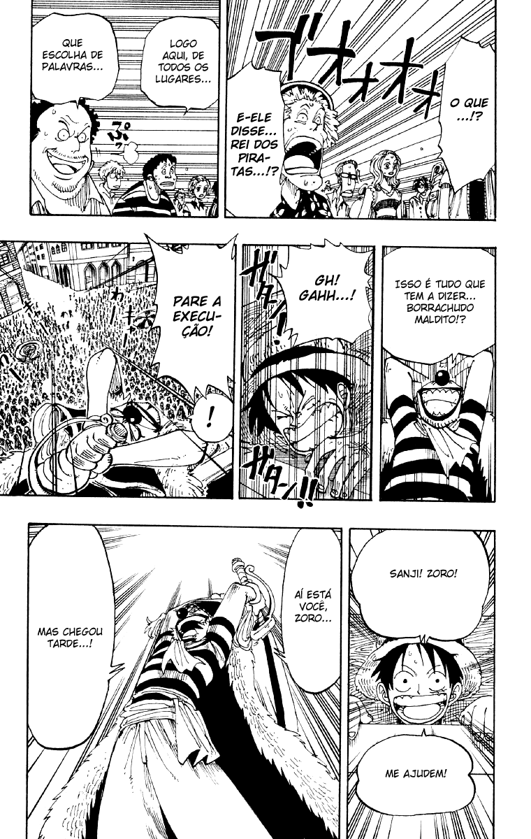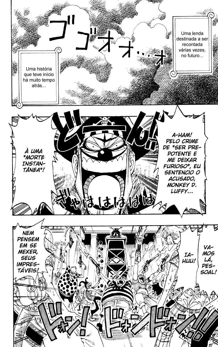 Capítulo 1 - Romance DawnCapítulo 1 - Romance Dawn ~O Alvorecer da Aventura~Capítulo 2 - O Garoto "Luffy do Chapéu de Palha"Capítulo 3 - Surge Zoro, o Caçador de PiratasCapítulo 3 - Zoro, O Caçador de PiratasCapítulo 4 - O Capitão da Marinha "Morgan Braço de Machado"Capítulo 5 - O Rei dos Piratas e o Melhor EspadachimCapítulo 6 - O Primeiro do BandoCapítulo 7 - AmigosCapítulo 8 - Apresentando NamiCapítulo 9 - Mulher DiabólicaCapítulo 10 - Incidente na TavernaCapítulo 11 - VôoCapítulo 12 - CãoCapítulo 13 - TesouroCapítulo 14 - Imprudência!!Capítulo 15 - GongoCapítulo 16 - Contra!! O Bando Pirata do BuggyCapítulo 17 - AvaliaçãoCapítulo 18 - O Pirata "Buggy, o Palhaço"Capítulo 19 - Akuma no MiCapítulo 20 - A Filosofia da LadraCapítulo 21 - CidadãosCapítulo 22 - Você é um Espécime RaroCapítulo 23 - Apresentando Capitão UsoppCapítulo 24 - Coisas Que Não se Pode MentirCapítulo 25 - 800 MentirasCapítulo 26 - O Plano do Capitão KuroCapítulo 27 - PlanoCapítulo 28 - Lua CrescenteCapítulo 29 - A LadeiraCapítulo 30 - Excelente!!!Capítulo 31 - A VerdadeCapítulo 32 - Grande InfortúnioCapítulo 33 - O Homem SorrateiroCapítulo 34 - O Mordomo KlahadorCapítulo 35 - Ladeira ÍngremeCapítulo 36 - Perseguição!!Capítulo 37 - O Pirata "Kuro dos Mil Truques"Capítulo 38 - O Bando PirataCapítulo 39 - Para Quem o Sino TocaCapítulo 40 - O Bando Pirata do UsoppCapítulo 41 - Para o MarCapítulo 42 - Yosaku e JohnnyCapítulo 43 - Apresentando SanjiCapítulo 44 - Os Três CozinheirosCapítulo 45 - Antes da TempestadeCapítulo 46 - Convidado InesperadoCapítulo 47 - Almirante da Frota Pirata, "Don Krieg"Capítulo 48 - Não Vá Para Aquela RotaCapítulo 49 - TempestadeCapítulo 50 - Meu Próprio DestinoCapítulo 51 - Roronoa Zoro Cai no MarCapítulo 52 - JuramentoCapítulo 53 - Peixe Pequeno Nº 1Capítulo 54 - Pearl-sanCapítulo 55 - Floresta SangrentaCapítulo 56 - De Jeito NenhumCapítulo 57 - Por Trás do SonhoCapítulo 58 - Velho de MerdaCapítulo 59 - DívidaCapítulo 60 - Pagando a DívidaCapítulo 61 - DemônioCapítulo 62 - MH5Capítulo 63 - Não Vou MorrerCapítulo 64 - A Arma SupremaCapítulo 65 - Prepare-seCapítulo 66 - A Lança é DestruídaCapítulo 67 - SopaCapítulo 68 - O Quarto do BandoCapítulo 69 - Arlong ParkCapítulo 70 - A Grande Aventura do Homem UsoppCapítulo 71 - O Senhor da CriaçãoCapítulo 72 - Vivendo AdequadamenteCapítulo 73 - O Monstro Vindo da Grand LineCapítulo 74 - NegóciosCapítulo 75 - Mapas e TritõesCapítulo 76 - DormirCapítulo 77 - O Primeiro Passo do SonhoCapítulo 78 - Bellemère-sanCapítulo 79 - ViverCapítulo 80 - Uma Ladra é uma LadraCapítulo 81 - LágrimasCapítulo 82 - Certo, Vamos LEVANTAR!Capítulo 83 - Luffy de PretoCapítulo 84 - ZumbiCapítulo 85 - Santouryuu Contra RokutouryuuCapítulo 86 - Heroísmo VS Karate TritãoCapítulo 87 - Acabou!!Capítulo 88 - Morra!!!Capítulo 89 - TrocaCapítulo 90 - O Que Você Pode Fazer?Capítulo 91 - DardosCapítulo 92 - FelicidadeCapítulo 93 - DemolindoCapítulo 94 - A Segunda do BandoCapítulo 95 - Gire Cata-ventoCapítulo 96 - O Pior Homem do LesteCapítulo 97 - Kitetsu TerceiraCapítulo 98 - Nunvens NegrasCapítulo 99 - Luffy é MortoCapítulo 100 - O Início de uma LendaCapítulo 101 - Reverse MountainCapítulo 102 - Agora, a Grand LineCapítulo 103 - BaleiaCapítulo 104 - O Cabo da PromessaCapítulo 105 - Log PoseCapítulo 106 - A Cidade HospitaleiraCapítulo 107 - Luar e SepulturasCapítulo 108 - 100 Caçadores de RecompensasCapítulo 109 - Problemas de ResponsabilidadeCapítulo 110 - Noite Sem FimCapítulo 111 - Sindicato Secreto de CrimesCapítulo 112 - ZoroCapítulo 113 - Está Tudo Bem!!!Capítulo 114 - RotaCapítulo 115 - Aventura em Little GardenCapítulo 116 - GigantesCapítulo 117 - BrogyCapítulo 118 - Há Alguém AquiCapítulo 119 - Golpe BaixoCapítulo 120 - O Ogro Vermelho ChoraCapítulo 121 - Eu SabiaCapítulo 122 - Um Peso Morto Não AjudaCapítulo 123 - Mr. 3Capítulo 124 - Maldito Chá DeliciosoCapítulo 125 - Candle ChampionCapítulo 126 - InstintoCapítulo 127 - Denden-mushiCapítulo 128 - Orgulho PirataCapítulo 129 - Seguir em Frente!!!Capítulo 130 - Velocidade MáximaCapítulo 131 - Wapol, o BlikCapítulo 132 - Vê?Capítulo 133 - Aventura no País Sem NomeCapítulo 134 - Dra. KurehaCapítulo 135 - LapahnCapítulo 136 - O Homem Chamado DoltonCapítulo 137 - AvalancheCapítulo 138 - TopoCapítulo 139 - Apresentando Tony Tony ChopperCapítulo 140 - Vivendo num Castelo de NeveCapítulo 141 - CurandeiroCapítulo 142 - Caveira e Flores de CerejeiraCapítulo 143 - DesajeitadoCapítulo 144 - Um Conto de InvernoCapítulo 145 - Determinação HerdadaCapítulo 146 - Batalha para Defender o PaísCapítulo 147 - FraudeCapítulo 148 - IndestrutívelCapítulo 149 - Estrondo!!Capítulo 150 - O Canhão Bliking de 7 Tiros da Coroa Real de DrumCapítulo 151 - O Céu de DrumCapítulo 152 - Lua CheiaCapítulo 153 - As Flores de Cerejeira do HirulukCapítulo 154 - Para AlabastaCapítulo 155 - O Pirata Sir CrocodileCapítulo 156 - Clima OkamaCapítulo 157 - Apresentando AceCapítulo 158 - Desembracando em AlabastaCapítulo 159 - VenhaCapítulo 160 - 8:00 pm no Spiders CaféCapítulo 161 - Erumalu, a Cidade VerdeCapítulo 162 - Aventura no País DesérticoCapítulo 163 - Yuba, a Cidade da Armada RebeldeCapítulo 164 - Eu Amo Esse PaísCapítulo 165 - Operação: UtopiaCapítulo 166 - Luffy VS ViviCapítulo 167 - Linha de FrenteCapítulo 168 - Rainbase, a Cidade dos SonhosCapítulo 169 - O Guerreiro Mais Forte do ReinoCapítulo 170 - ComeçaCapítulo 171 - Koza, o Líder da Armada RebeldeCapítulo 172 - RebeliãoCapítulo 173 - Crocodilos-bananaCapítulo 174 - Mr. PríncipeCapítulo 175 - LibertaçãoCapítulo 176 - Corram!!Capítulo 177 - 30 Milhões VS 81 MilhõesCapítulo 178 - Nível G. L.Capítulo 179 - Batalha Decisiva em AlubarnaCapítulo 180 - A Fauna de AlabastaCapítulo 181 - O Quiz dos Super Patos-de-Bico-ListradoCapítulo 182 - RugidoCapítulo 