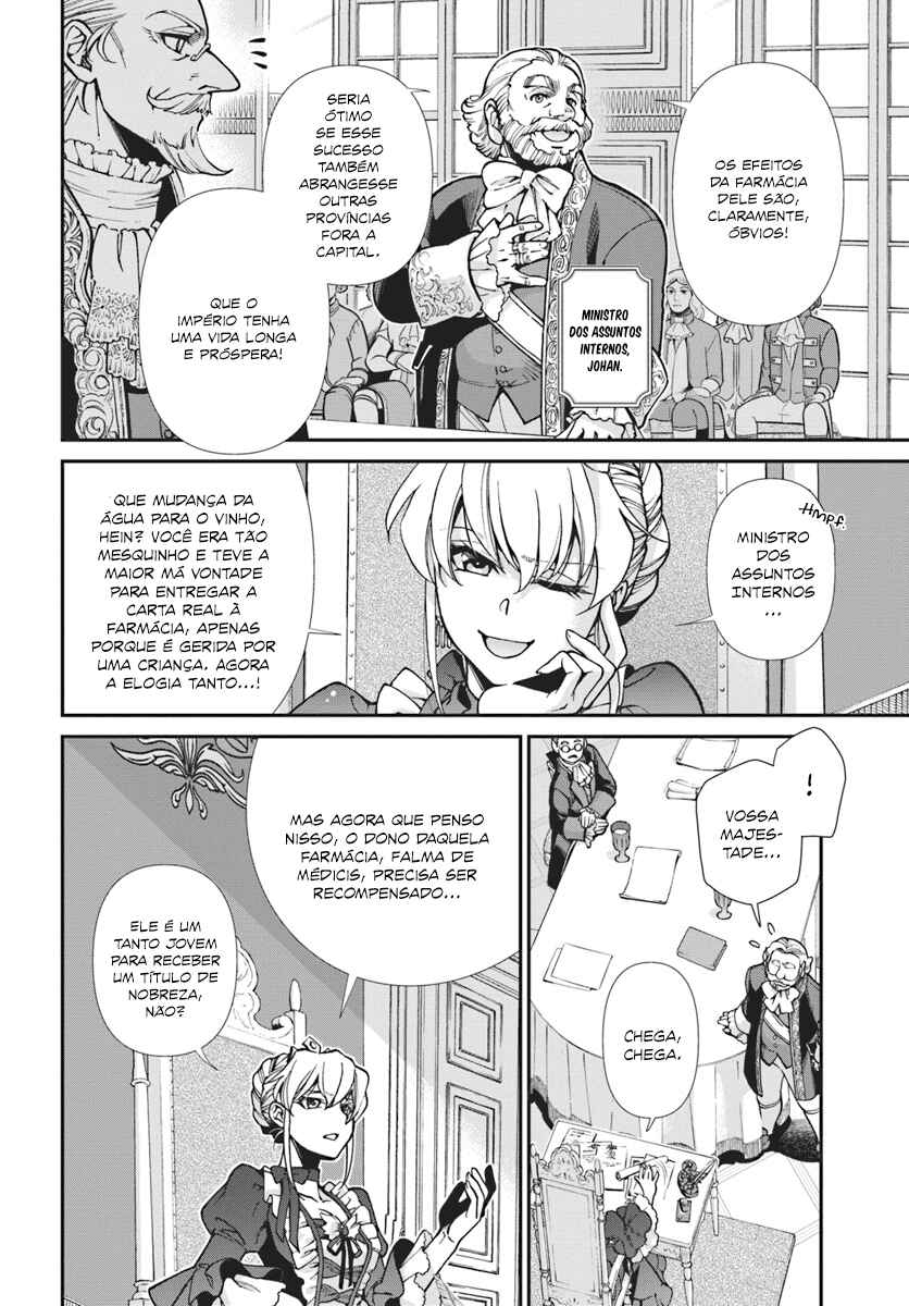 Capítulo 1 - O Farmacêutico que reviveu em outro mundoCapítulo 2 - Curso de artes divinas da EleanoraCapítulo 3Capítulo 4 - O exame médico da imperatriz Elizabeth IICapítulo 5Capítulo 6 - O ato constituinte da imperatrizCapítulo 7 - Estabelecendo a farmáciaCapítulo 8 - Abrindo uma farmácia em outro mundoCapítulo 9 - Cosméticos e tratamento bucalCapítulo 10.1 - A inspeção de Marselha, e o futuro da medicina (1)Capítulo 10.2 - A inspeção de Marselha, e o futuro da medicina (2)Capítulo 11 - Cotidiano em outro mundo farmacêutico, com a brigada do jaleco branco chegandoCapítulo 12 - O garoto sem sombra e a inquisição (1)Capítulo 13 - O garoto sem sombra e a inquisição (2)Capítulo 14 - O garoto sem sombra e a inquisição (3)Capítulo 15 - Baronesa Melodie Le RouxCapítulo 16 - Melodie, especialista e artesã das chamas médicas Capítulo 17.1 - Influenza e o caso de um certo farmacêutico (1)Capítulo 17.2 - Influenza e o caso de um certo farmacêutico (2)Capítulo 17.3 - Influenza e o caso de um certo farmacêutico (3)Capítulo 18 - Magia de FalmaCapítulo 19 - Cajado do Deus da medicina Capítulo 20.1 - O retorno de Palle (1)Capítulo 20.2 - O retorno de Palle (2)Capítulo 21 - Tecnologia de ponta Capítulo 22 - Os soluços da LotteCapítulo 23 - A expedição de Palle pela capitalCapítulo 24.1 - A chegada da Peste Negra (1)Capítulo 24.2 - A chegada da Peste Negra (2)Capítulo 25 - O caminho para a quarentena (1)Capítulo 26 - O caminho para a quarentena (2)Capítulo 27.1 - Um presságio Milagroso e a destacável Actinobactéria (1)Capítulo 27.2 - Um presságio Milagroso e a destacável Actinobactéria (2)Capítulo 28 - O início dos diagnósticos Capítulo 29 - A medicina moderna e as artes divinasCapítulo 30.1 - O melhor de cada um (1)Capítulo 30.2 - O melhor de cada um (2)Capítulo 31 - O vestígio de um culpadoCapítulo 32 - A capital de San Fleuve é atacadaCapítulo 33 - A capital em caosCapítulo 34 - A história de um certo homem mauCapítulo 35.1 - "Voltando à capital" (1)Capítulo 35.2 - "Voltando à capital" (2)Capítulo 36 - A presa venenosa do espírito malignoCapítulo 37 - Aquele que não pode ser salvoCapítulo 38 - A luta dos farmacêuticosCapítulo 39 - O fim da peste negraCapítulo 40 - Buscadores de conhecimentoCapítulo 41 - Petição da universidade dos farmacêuticos imperiaisCapítulo 42 - Lord Melody Lu Lou e a invenção do estêncilCapítulo 43 - Termas e a marca incompleta do Deus do FogoCapítulo 44 - Presente para LotteCapítulo 44.2 - Presente para LotteCapítulo 45Capítulo 46 - Primeira Fábrica de Marseille