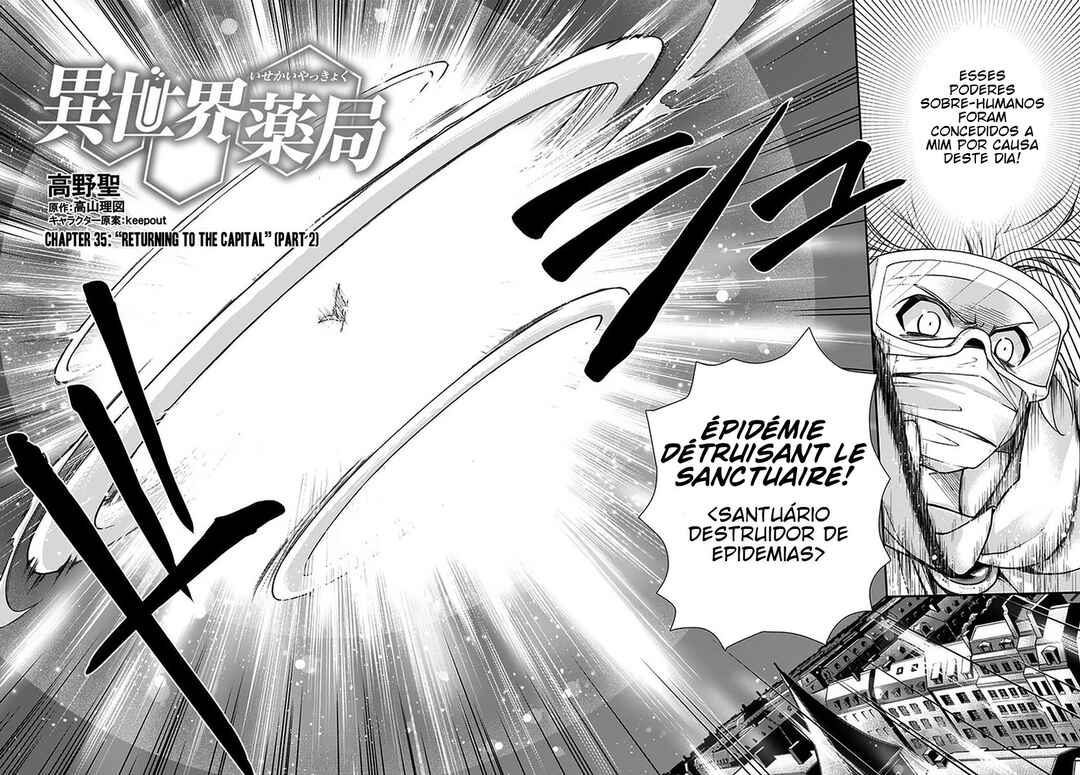Capítulo 1 - O Farmacêutico que reviveu em outro mundoCapítulo 2 - Curso de artes divinas da EleanoraCapítulo 3Capítulo 4 - O exame médico da imperatriz Elizabeth IICapítulo 5Capítulo 6 - O ato constituinte da imperatrizCapítulo 7 - Estabelecendo a farmáciaCapítulo 8 - Abrindo uma farmácia em outro mundoCapítulo 9 - Cosméticos e tratamento bucalCapítulo 10.1 - A inspeção de Marselha, e o futuro da medicina (1)Capítulo 10.2 - A inspeção de Marselha, e o futuro da medicina (2)Capítulo 11 - Cotidiano em outro mundo farmacêutico, com a brigada do jaleco branco chegandoCapítulo 12 - O garoto sem sombra e a inquisição (1)Capítulo 13 - O garoto sem sombra e a inquisição (2)Capítulo 14 - O garoto sem sombra e a inquisição (3)Capítulo 15 - Baronesa Melodie Le RouxCapítulo 16 - Melodie, especialista e artesã das chamas médicas Capítulo 17.1 - Influenza e o caso de um certo farmacêutico (1)Capítulo 17.2 - Influenza e o caso de um certo farmacêutico (2)Capítulo 17.3 - Influenza e o caso de um certo farmacêutico (3)Capítulo 18 - Magia de FalmaCapítulo 19 - Cajado do Deus da medicina Capítulo 20.1 - O retorno de Palle (1)Capítulo 20.2 - O retorno de Palle (2)Capítulo 21 - Tecnologia de ponta Capítulo 22 - Os soluços da LotteCapítulo 23 - A expedição de Palle pela capitalCapítulo 24.1 - A chegada da Peste Negra (1)Capítulo 24.2 - A chegada da Peste Negra (2)Capítulo 25 - O caminho para a quarentena (1)Capítulo 26 - O caminho para a quarentena (2)Capítulo 27.1 - Um presságio Milagroso e a destacável Actinobactéria (1)Capítulo 27.2 - Um presságio Milagroso e a destacável Actinobactéria (2)Capítulo 28 - O início dos diagnósticos Capítulo 29 - A medicina moderna e as artes divinasCapítulo 30.1 - O melhor de cada um (1)Capítulo 30.2 - O melhor de cada um (2)Capítulo 31 - O vestígio de um culpadoCapítulo 32 - A capital de San Fleuve é atacadaCapítulo 33 - A capital em caosCapítulo 34 - A história de um certo homem mauCapítulo 35.1 - "Voltando à capital" (1)Capítulo 35.2 - "Voltando à capital" (2)Capítulo 36 - A presa venenosa do espírito malignoCapítulo 37 - Aquele que não pode ser salvoCapítulo 38 - A luta dos farmacêuticosCapítulo 39 - O fim da peste negraCapítulo 40 - Buscadores de conhecimentoCapítulo 41 - Petição da universidade dos farmacêuticos imperiaisCapítulo 42 - Lord Melody Lu Lou e a invenção do estêncilCapítulo 43 - Termas e a marca incompleta do Deus do FogoCapítulo 44 - Presente para LotteCapítulo 44.2 - Presente para LotteCapítulo 45Capítulo 46 - Primeira Fábrica de Marseille