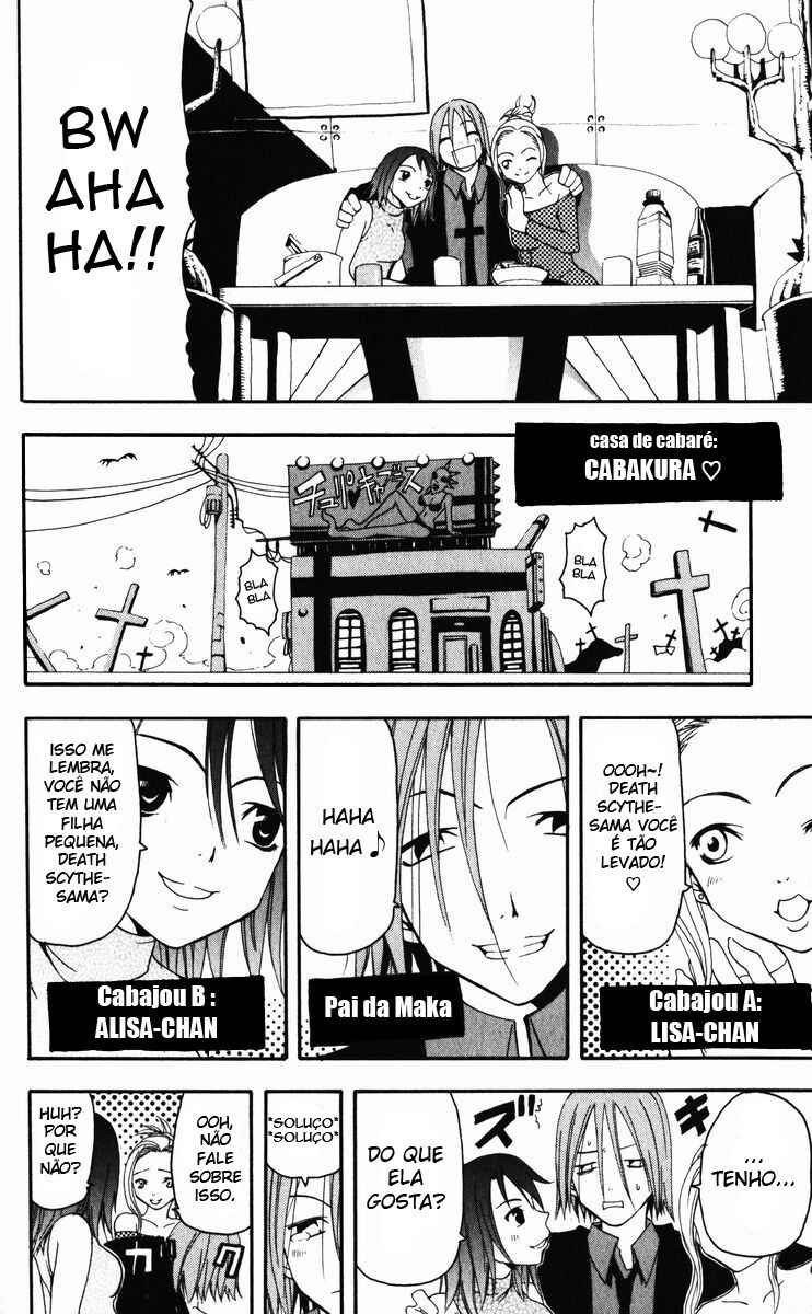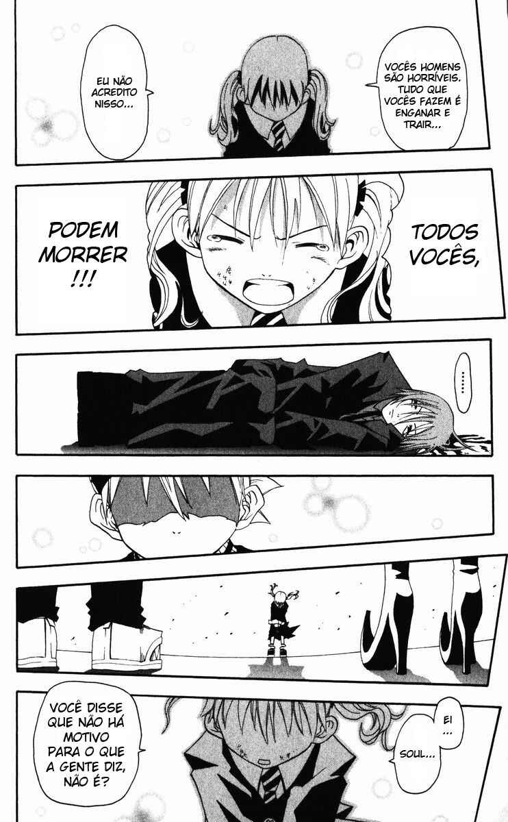 Capítulo 0.1 - Soul EaterCapítulo 0.2 - Black StarCapítulo 0.3 - Death the KiddCapítulo 1 - Lições Extras (Parte 1)Capítulo 2 - Lições Extras (Parte 2)Capítulo 3 - "O Novo Estudante" e "Observação da Alma"Capítulo 4 - A Espada Demoníaca Ragnarok (Parte 1)Capítulo 5 - A Espada Demoníaca Ragnarok (Parte 2)Capítulo 6 - SeikenCapítulo 7 - Lâmina Demônio (Parte 1)Capítulo 8 - Lâmina Demônio (Parte 2)Capítulo 9 - Alma Perseverante Capítulo 10 - Experimento (Parte 1)Capítulo 11 - Experimento (Parte 2)Capítulo 12 - (Super) Exame CopiadorCapítulo 13 - Dragão Negro (Parte 1)Capítulo 14 - Dragão Negro (Parte 2)Capítulo 15 - Aniversário de fundação, véspera de NatalCapítulo 16 - Lutando até a Morte (Parte 1)Capítulo 17 - Lutando até a Morte (Parte 2)Capítulo 18 - Lutando até a Morte (Parte 3)Capítulo 19 - Lutando até a Morte (Parte 4)Capítulo 20 - Lutando até a Morte (Parte 5)Capítulo 21 - Lutando até a Morte (Parte 6)Capítulo 22 - Lutando até a Morte (Parte 7)Capítulo 23 - NormalCapítulo 24 - Estudante em Teste (Parte 1)Capítulo 25 - Estudante em Teste (Parte 2)Capítulo 26 - Estudante em Teste (Parte 3)Capítulo 27 - Guarda-Costas (Parte 1)Capítulo 28 - Guarda-Costas (Parte 2)Capítulo 29 - CobraCapítulo 30 - Reunião-Expresso (Parte 1)Capítulo 31 - Reunião-Expresso (Parte 2)Capítulo 32 - O canto do quartoCapítulo 32.5 - EspecialCapítulo 33 - Arte do DueloCapítulo 34 - Tempestade de "Fermento" (Parte 1)Capítulo 35 - Tempestade de "Fermento" (Parte 2)Capítulo 36 - Tempestade de "Fermento" (Parte 3)Capítulo 37 - Tempestade de "Fermento" (Parte 4)Capítulo 38 - Assuntos Internos (Parte 1)Capítulo 39 - Assuntos Internos (Parte 2)Capítulo 40 - Decisão Capítulo 41 - O Palhaço (Parte 1)Capítulo 42 - O Palhaço (Parte 2)Capítulo 43 - O Palhaço (Parte 3)Capítulo 44 - EscolhaCapítulo 45 - AcordoCapítulo 46 - Operação: Captura do castelo de Baba Yaga (Parte 1)Capítulo 47 - Operação: Captura do castelo de Baba Yaga (Parte 2)Capítulo 48 - Operação: Captura do castelo de Baba Yaga (Parte 3)Capítulo 49 - Operação: Captura do castelo de Baba Yaga (Parte 4)Capítulo 50 - Operação: Captura do castelo de Baba Yaga (Parte 5)Capítulo 51 - Operação: Captura do castelo de Baba Yaga (Parte 6)Capítulo 52 - Operação: Captura do castelo de Baba Yaga (Parte 7)Capítulo 53 - Operação: Captura do castelo de Baba Yaga (Parte 8)Capítulo 54 - Operação: Captura do castelo de Baba Yaga (Parte 9)Capítulo 55 - Operação: Captura do castelo de Baba Yaga (Parte 10)Capítulo 56 - Operação para Invadir o Castelo de Baba Yaga (Parte 11)Capítulo 57 - Operação para Invadir o Castelo de Baba Yaga (Parte 12)Capítulo 58 - Operação para Invadir o Castelo de Baba Yaga (Parte 13)Capítulo 59 - Operação para Invadir o Castelo de Baba Yaga (Parte 14)Capítulo 60 - Operação para Invadir o Castelo de Baba Yaga (Parte 15)Capítulo 61 - Ajeitando as Coisas, e Novos Começos.Capítulo 62 - FormaçãoCapítulo 63 - Vou Ser um AnjoCapítulo 64 - ProntidãoCapítulo 65 - Asas Negras VS Asas BrancasCapítulo 66 - A Pesquisa da Bruxa (Início)Capítulo 67 - A Pesquisa da Bruxa (Fim)Capítulo 68 - Abismo, Imundice, EscuridãoCapítulo 69 - Triângulo AmorosoCapítulo 70 - Viagem de NegóciosCapítulo 71 - O Antigo GovernanteCapítulo 71.5 - Salvamento (Parte 1)Capítulo 73 - Salvamento (Parte 2)Capítulo 74 - Salvamento (Parte 3)Capítulo 75 - Salvamento (Parte 4)Capítulo 76 - Salvamento (Parte 5)Capítulo 77 - Salvamento (Parte 6)Capítulo 78 - Salvamento (Parte 7)Capítulo 79 - Salvamento (Parte 8)Capítulo 80 - Salvamento (Parte 9)Capítulo 81 - Salvamento (Parte 10)Capítulo 82 - ParadeiroCapítulo 83 - Sangue InsanoCapítulo 84 - RecuperaçãoCapítulo 85 - PerseguiçãoCapítulo 86 - Fogo do InfernoCapítulo 87 - Apenas uma Simples História Sobre Matar PessoasCapítulo 88 - CaçaCapítulo 89 - Há Alguém para AdmirarCapítulo 90 - LuaCapítulo 91 - A Batalha na Lua (Parte 1)Capítulo 92 - A Batalha na Lua (Parte 2)Capítulo 93 - A Batalha na Lua (Parte 3)Capítulo 94 - A Batalha na Lua (Parte 4)Capítulo 95 - A Batalha na Lua (Parte 5)Capítulo 96 - A Batalha na Lua (Parte 6)Capítulo 97 - A Batalha na Lua (Parte 7)Capítulo 98 - O Julgamento da BruxaCapítulo 99 - Roger!Capítulo 100 - Para a LuaCapítulo 101 - 2ª Batalha na Lua (Parte 1)Capítulo 102 - 2ª Batalha na Lua (Parte 2)Capítulo 103 - 2ª Batalha na Lua (Parte 3)Capítulo 104 - O Lado Negro da Lua ICapítulo 105 - O Lado Negro da Lua IICapítulo 106 - O Lado Negro da Lua IIICapítulo 107 - O Lado Negro da Lua IVCapítulo 108 - O Lado Negro da Lua VCapítulo 109 - O Lado Negro da Lua VICapítulo 110 - O Lado Negro da Lua VIICapítulo 111 - O Lado Negro da Lua VIIICapítulo 112 - O Lado Negro da Lua IXCapítulo 113 - Uma Alma Sã Reside em um Espírito São e um Corpo São