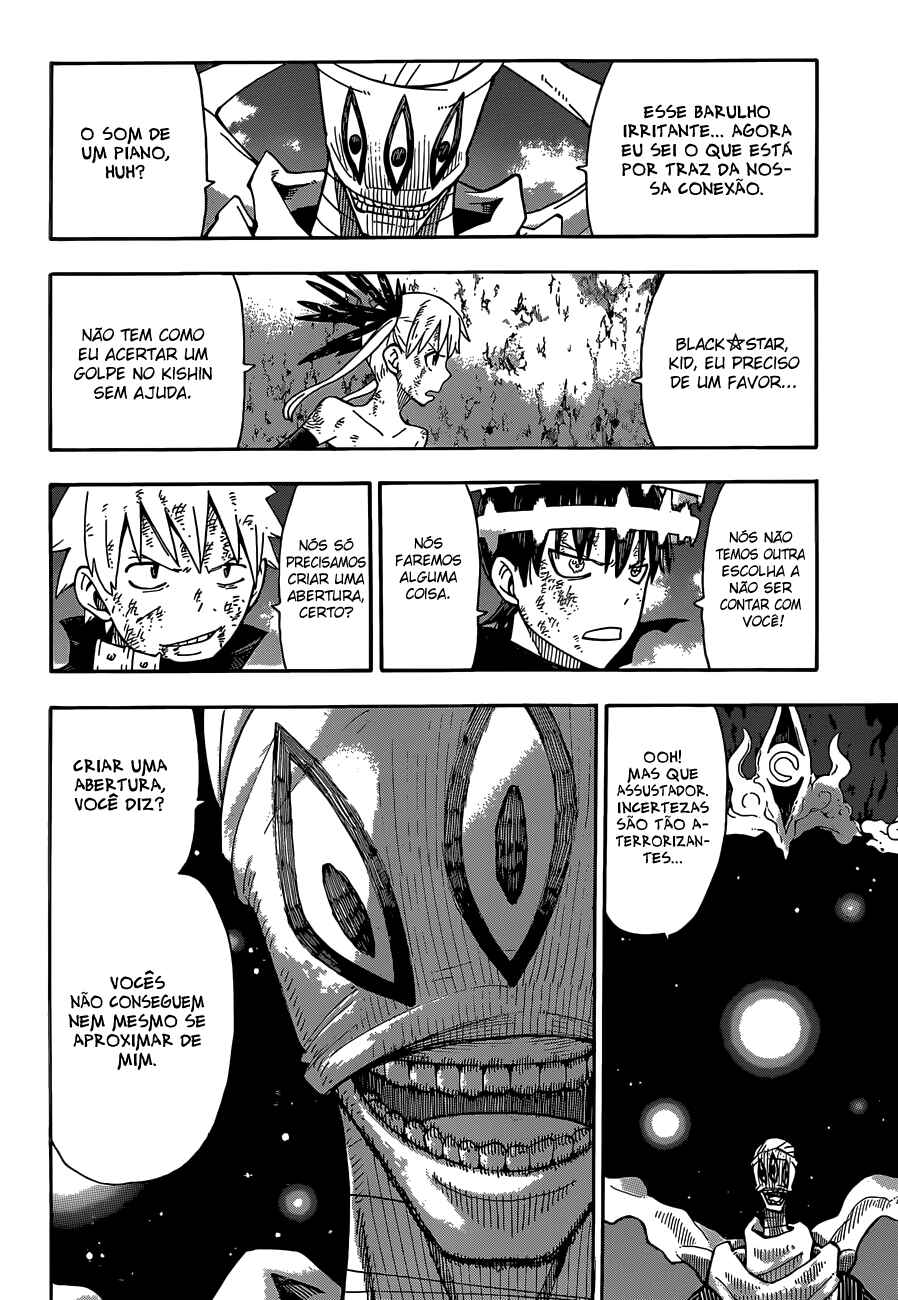 Capítulo 0.1 - Soul EaterCapítulo 0.2 - Black StarCapítulo 0.3 - Death the KiddCapítulo 1 - Lições Extras (Parte 1)Capítulo 2 - Lições Extras (Parte 2)Capítulo 3 - "O Novo Estudante" e "Observação da Alma"Capítulo 4 - A Espada Demoníaca Ragnarok (Parte 1)Capítulo 5 - A Espada Demoníaca Ragnarok (Parte 2)Capítulo 6 - SeikenCapítulo 7 - Lâmina Demônio (Parte 1)Capítulo 8 - Lâmina Demônio (Parte 2)Capítulo 9 - Alma Perseverante Capítulo 10 - Experimento (Parte 1)Capítulo 11 - Experimento (Parte 2)Capítulo 12 - (Super) Exame CopiadorCapítulo 13 - Dragão Negro (Parte 1)Capítulo 14 - Dragão Negro (Parte 2)Capítulo 15 - Aniversário de fundação, véspera de NatalCapítulo 16 - Lutando até a Morte (Parte 1)Capítulo 17 - Lutando até a Morte (Parte 2)Capítulo 18 - Lutando até a Morte (Parte 3)Capítulo 19 - Lutando até a Morte (Parte 4)Capítulo 20 - Lutando até a Morte (Parte 5)Capítulo 21 - Lutando até a Morte (Parte 6)Capítulo 22 - Lutando até a Morte (Parte 7)Capítulo 23 - NormalCapítulo 24 - Estudante em Teste (Parte 1)Capítulo 25 - Estudante em Teste (Parte 2)Capítulo 26 - Estudante em Teste (Parte 3)Capítulo 27 - Guarda-Costas (Parte 1)Capítulo 28 - Guarda-Costas (Parte 2)Capítulo 29 - CobraCapítulo 30 - Reunião-Expresso (Parte 1)Capítulo 31 - Reunião-Expresso (Parte 2)Capítulo 32 - O canto do quartoCapítulo 32.5 - EspecialCapítulo 33 - Arte do DueloCapítulo 34 - Tempestade de "Fermento" (Parte 1)Capítulo 35 - Tempestade de "Fermento" (Parte 2)Capítulo 36 - Tempestade de "Fermento" (Parte 3)Capítulo 37 - Tempestade de "Fermento" (Parte 4)Capítulo 38 - Assuntos Internos (Parte 1)Capítulo 39 - Assuntos Internos (Parte 2)Capítulo 40 - Decisão Capítulo 41 - O Palhaço (Parte 1)Capítulo 42 - O Palhaço (Parte 2)Capítulo 43 - O Palhaço (Parte 3)Capítulo 44 - EscolhaCapítulo 45 - AcordoCapítulo 46 - Operação: Captura do castelo de Baba Yaga (Parte 1)Capítulo 47 - Operação: Captura do castelo de Baba Yaga (Parte 2)Capítulo 48 - Operação: Captura do castelo de Baba Yaga (Parte 3)Capítulo 49 - Operação: Captura do castelo de Baba Yaga (Parte 4)Capítulo 50 - Operação: Captura do castelo de Baba Yaga (Parte 5)Capítulo 51 - Operação: Captura do castelo de Baba Yaga (Parte 6)Capítulo 52 - Operação: Captura do castelo de Baba Yaga (Parte 7)Capítulo 53 - Operação: Captura do castelo de Baba Yaga (Parte 8)Capítulo 54 - Operação: Captura do castelo de Baba Yaga (Parte 9)Capítulo 55 - Operação: Captura do castelo de Baba Yaga (Parte 10)Capítulo 56 - Operação para Invadir o Castelo de Baba Yaga (Parte 11)Capítulo 57 - Operação para Invadir o Castelo de Baba Yaga (Parte 12)Capítulo 58 - Operação para Invadir o Castelo de Baba Yaga (Parte 13)Capítulo 59 - Operação para Invadir o Castelo de Baba Yaga (Parte 14)Capítulo 60 - Operação para Invadir o Castelo de Baba Yaga (Parte 15)Capítulo 61 - Ajeitando as Coisas, e Novos Começos.Capítulo 62 - FormaçãoCapítulo 63 - Vou Ser um AnjoCapítulo 64 - ProntidãoCapítulo 65 - Asas Negras VS Asas BrancasCapítulo 66 - A Pesquisa da Bruxa (Início)Capítulo 67 - A Pesquisa da Bruxa (Fim)Capítulo 68 - Abismo, Imundice, EscuridãoCapítulo 69 - Triângulo AmorosoCapítulo 70 - Viagem de NegóciosCapítulo 71 - O Antigo GovernanteCapítulo 71.5 - Salvamento (Parte 1)Capítulo 73 - Salvamento (Parte 2)Capítulo 74 - Salvamento (Parte 3)Capítulo 75 - Salvamento (Parte 4)Capítulo 76 - Salvamento (Parte 5)Capítulo 77 - Salvamento (Parte 6)Capítulo 78 - Salvamento (Parte 7)Capítulo 79 - Salvamento (Parte 8)Capítulo 80 - Salvamento (Parte 9)Capítulo 81 - Salvamento (Parte 10)Capítulo 82 - ParadeiroCapítulo 83 - Sangue InsanoCapítulo 84 - RecuperaçãoCapítulo 85 - PerseguiçãoCapítulo 86 - Fogo do InfernoCapítulo 87 - Apenas uma Simples História Sobre Matar PessoasCapítulo 88 - CaçaCapítulo 89 - Há Alguém para AdmirarCapítulo 90 - LuaCapítulo 91 - A Batalha na Lua (Parte 1)Capítulo 92 - A Batalha na Lua (Parte 2)Capítulo 93 - A Batalha na Lua (Parte 3)Capítulo 94 - A Batalha na Lua (Parte 4)Capítulo 95 - A Batalha na Lua (Parte 5)Capítulo 96 - A Batalha na Lua (Parte 6)Capítulo 97 - A Batalha na Lua (Parte 7)Capítulo 98 - O Julgamento da BruxaCapítulo 99 - Roger!Capítulo 100 - Para a LuaCapítulo 101 - 2ª Batalha na Lua (Parte 1)Capítulo 102 - 2ª Batalha na Lua (Parte 2)Capítulo 103 - 2ª Batalha na Lua (Parte 3)Capítulo 104 - O Lado Negro da Lua ICapítulo 105 - O Lado Negro da Lua IICapítulo 106 - O Lado Negro da Lua IIICapítulo 107 - O Lado Negro da Lua IVCapítulo 108 - O Lado Negro da Lua VCapítulo 109 - O Lado Negro da Lua VICapítulo 110 - O Lado Negro da Lua VIICapítulo 111 - O Lado Negro da Lua VIIICapítulo 112 - O Lado Negro da Lua IXCapítulo 113 - Uma Alma Sã Reside em um Espírito São e um Corpo São