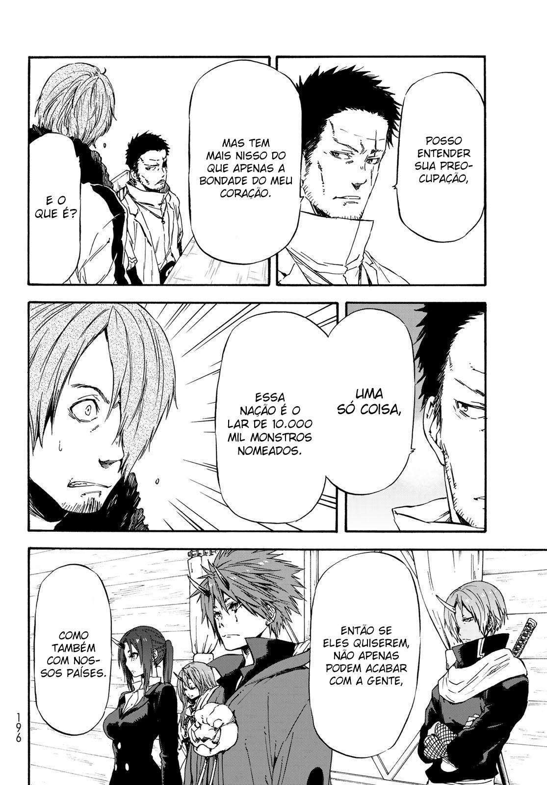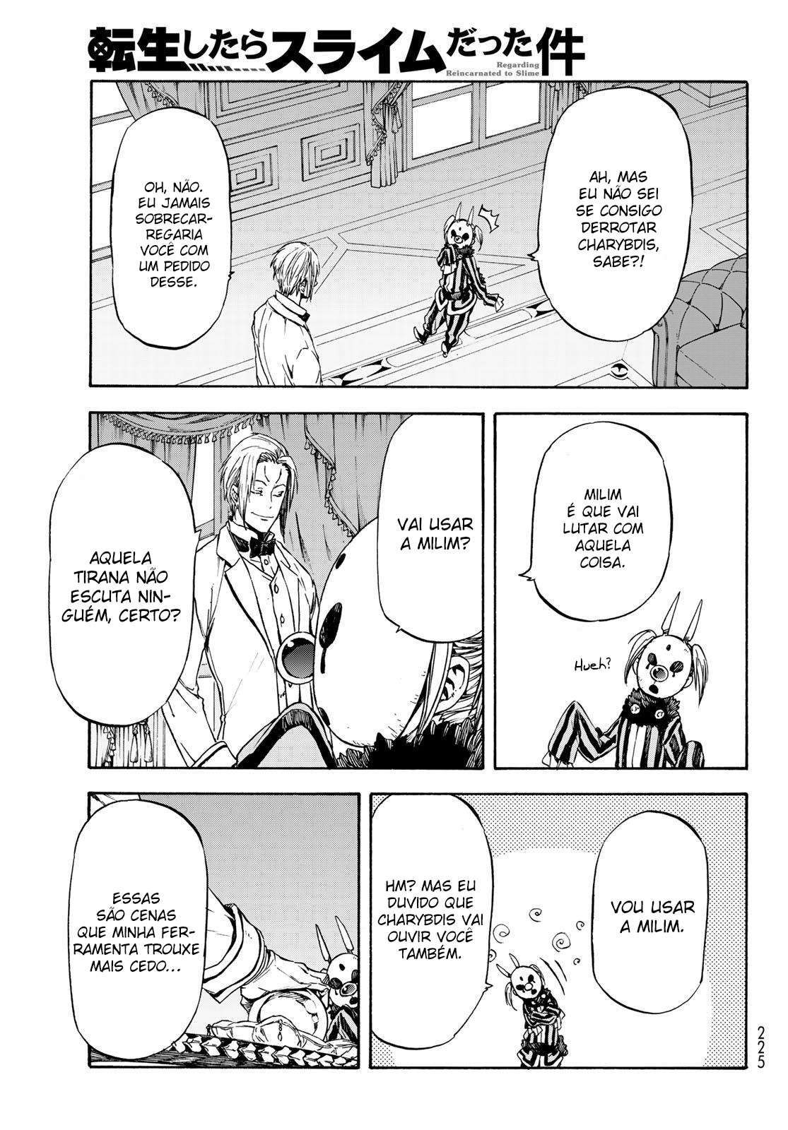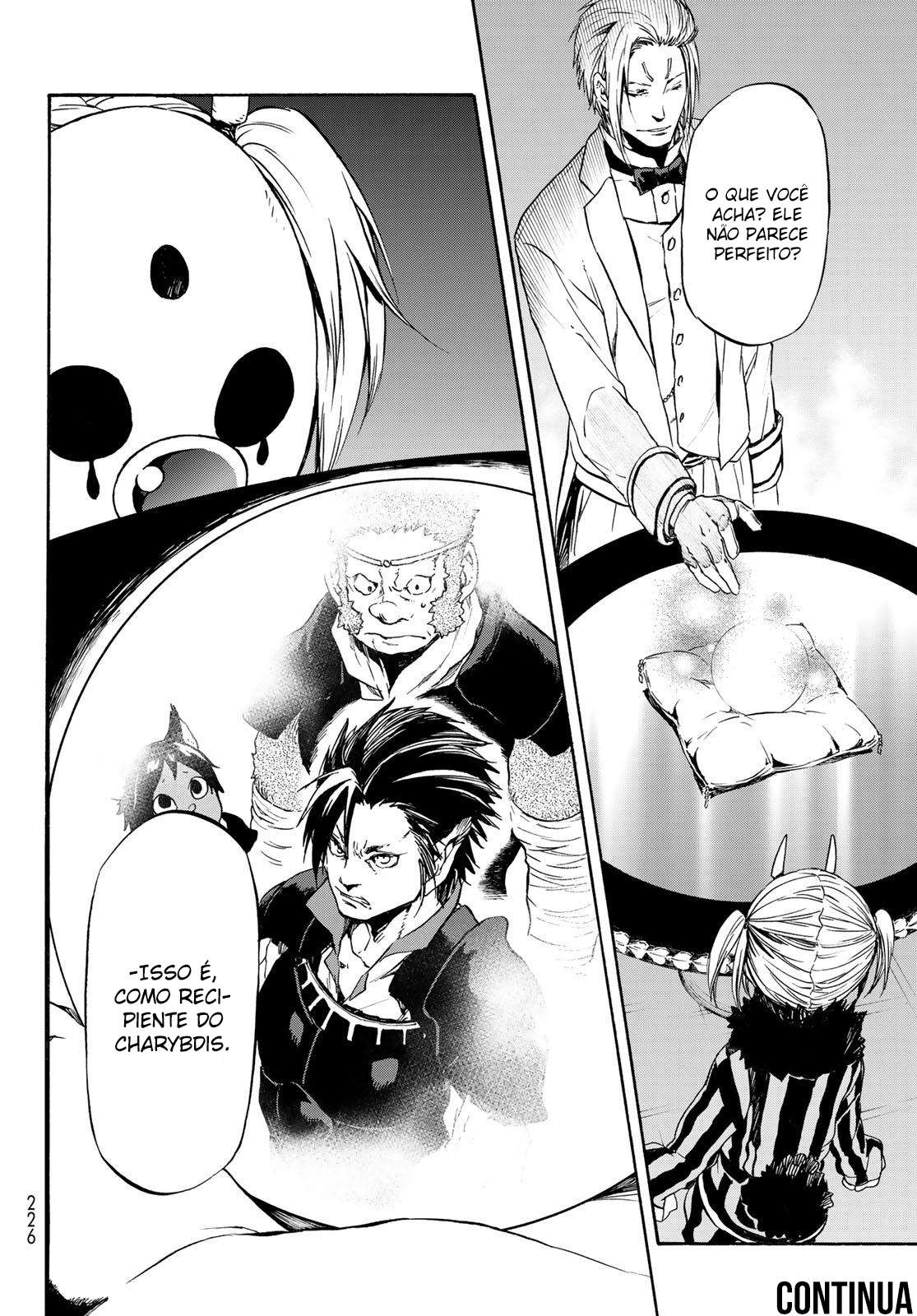 Capítulo 1 - Morte~ e ReencarnaçãoCapítulo 2 - Guardião da Vila GoblinCapítulo 3 - Slime vs Tribo dos Lobos de PresaCapítulo 4 - Destino: Reino dos AnõesCapítulo 5 - Artesão Anão!!Capítulo 6 - A Pessoa DestinadaCapítulo 7 - Julgamento do Rei HeróiCapítulo 8 - Fragrância FamiliarCapítulo 9 - O Demônio das ChamasCapítulo 10 - A Vontade HerdadaCapítulo 11 - O Começo da InquietaçãoCapítulo 12 - O Forte na Floresta JuraCapítulo 13 - Ataque dos OgrosCapítulo 14 - Afazeres de OgroCapítulo 15 - Grande Floresta e Diferentes MudançasCapítulo 16 - A Chegada de GabilCapítulo 17 - Gobuta vs GabilCapítulo 18 - Engrenagens do DestinoCapítulo 19 - Falsa VantagemCapítulo 20 - Início da GuerraCapítulo 21 - Os Efeitos Sobre a GuerraCapítulo 22 - Tempestade da MorteCapítulo 23 - Desastre OrcCapítulo 24 - O Admirável DemônioCapítulo 25 - Aquele que Devora TudoCapítulo 26 - A Grande Aliança da Floresta JuraCapítulo 27 - Um Lugar para RelaxarCapítulo 28 - Aqueles que Observam a Cidade dos DemôniosCapítulo 29 - Reunião do Rei dos DemôniosCapítulo 30 - A Lord DemônioCapítulo 31 - O Furação MilimCapítulo 32 - O Furação Milim (Conclusão)Capítulo 33 - O Plano dos Lordes DemônioCapítulo 34 - Aqueles que se Reúnem na Cidade dos MonstrosCapítulo 35 - O Plano do HeróiCapítulo 36 - Relatório do GerenteCapítulo 37 - CharybidsCapítulo 38 - Tirano da DestruiçãoCapítulo 39 - Como uma NaçãoCapítulo 40 - Negócios com YuurazaniaCapítulo 41 - O Convite do Rei Gazelle (Parte 1)Capítulo 42 - O Convite do Rei Gazelle (Parte 2)Capítulo 43 - Para o Reino HumanoCapítulo 44 - Reino Brumund (Parte 1)Capítulo 45 - Reino Brumund (Parte 2)Capítulo 46 - Yuuki KagurazakaCapítulo 47 - O Fardo dos HeróisCapítulo 48 - O Papel de um ProfessorCapítulo 49 - O Rico Comerciante Garde-MyourmilesCapítulo 50 - A Habilitação dos EspíritosCapítulo 51 - A Rainha dos EspíritosCapítulo 52 - Almas que podem ser salvasCapítulo 53Capítulo 54Capítulo 55Capítulo 56Capítulo 57Capítulo 58Capítulo 59Capítulo 60Capítulo 61Capítulo 62Capítulo 63Capítulo 64Capítulo 65Capítulo 65.5Capítulo 66Capítulo 67Capítulo 68Capítulo 69Capítulo 70Capítulo 71Capítulo 72Capítulo 73Capítulo 74Capítulo 75Capítulo 76 - Lordes Demônios e Dragões VerdadeirosCapítulo 77 - Véspera da batalhaCapítulo 78 - WalpurgisCapítulo 79 - BatalhaCapítulo 80 - O Retorno da Grande BestaCapítulo 81Capítulo 82Capítulo 84Capítulo 85 - Na Terra SagradaCapítulo 86Capítulo 87Capítulo 88Capítulo 89Capítulo 90 - O objetivo dos SantosCapítulo 91 - Nostalgia da Terra NatalCapítulo 92 - Segundo EncontroCapítulo 93 - Conflito entre "Bem" e "Mal"Capítulo 94 - O Sorriso do Demônio AntigoCapítulo 95Capítulo 96 - Deus e Lorde DemônioCapítulo 97Capítulo 98 - Relatório de ProgressoCapítulo 99 - Reconciliação e Acordos (1)Capítulo 100 - Reconciliação e Acordos (2)Capítulo 101 - Reconciliação e Acordos (2.5)Capítulo 102 - Convidando as outras nações Capítulo 103 - A Fada do LabirintoCapítulo 104 - Preparação para AberturaCapítulo 105 - O Começo do Romance da TenguCapítulo 106 - Audiências FormaisCapítulo 107 - O Herói da Velocidade da LuzCapítulo 108 - A Véspera do FestivalCapítulo 109 - Reuniões e EncontrosCapítulo 110 - Conquistas CulináriasCapítulo 111 - O Festival da FundaçãoCapítulo 112 - Um Problema SurgeCapítulo 113 - O Torneio de BatalhaCapítulo 114 - Encontro de MentesCapítulo 115 - As Finais e A ConversaCapítulo 116 - A Grande Abertura do LabirintoCapítulo 117 - Explorando o LabirintoCapítulo 118 - Após o FestivalCapítulo 119 - Uma Breve Negociação do LabirintoCapítulo 120 - A Ameaça SlimeCapítulo 121 - A Caminho do ConselhoCapítulo 122 - Em Direção à EngrassiaCapítulo 123 - O Conselho CaóticoCapítulo 124 - O Conselho Caótico 2Capítulo 125 - Por Trás das CortinasCapítulo 126 - A Armadilha da GanânciaCapítulo 127 - A Cidade Antiga de AmritaCapítulo 128 - Maribel, A GananciosaCapítulo 129 - O Fim da HumilhaçãoCapítulo 129 - O Fim da HumilhaçãoCapítulo 136