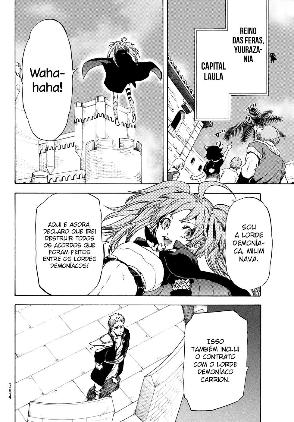 Capítulo 1 - Morte~ e ReencarnaçãoCapítulo 2 - Guardião da Vila GoblinCapítulo 3 - Slime vs Tribo dos Lobos de PresaCapítulo 4 - Destino: Reino dos AnõesCapítulo 5 - Artesão Anão!!Capítulo 6 - A Pessoa DestinadaCapítulo 7 - Julgamento do Rei HeróiCapítulo 8 - Fragrância FamiliarCapítulo 9 - O Demônio das ChamasCapítulo 10 - A Vontade HerdadaCapítulo 11 - O Começo da InquietaçãoCapítulo 12 - O Forte na Floresta JuraCapítulo 13 - Ataque dos OgrosCapítulo 14 - Afazeres de OgroCapítulo 15 - Grande Floresta e Diferentes MudançasCapítulo 16 - A Chegada de GabilCapítulo 17 - Gobuta vs GabilCapítulo 18 - Engrenagens do DestinoCapítulo 19 - Falsa VantagemCapítulo 20 - Início da GuerraCapítulo 21 - Os Efeitos Sobre a GuerraCapítulo 22 - Tempestade da MorteCapítulo 23 - Desastre OrcCapítulo 24 - O Admirável DemônioCapítulo 25 - Aquele que Devora TudoCapítulo 26 - A Grande Aliança da Floresta JuraCapítulo 27 - Um Lugar para RelaxarCapítulo 28 - Aqueles que Observam a Cidade dos DemôniosCapítulo 29 - Reunião do Rei dos DemôniosCapítulo 30 - A Lord DemônioCapítulo 31 - O Furação MilimCapítulo 32 - O Furação Milim (Conclusão)Capítulo 33 - O Plano dos Lordes DemônioCapítulo 34 - Aqueles que se Reúnem na Cidade dos MonstrosCapítulo 35 - O Plano do HeróiCapítulo 36 - Relatório do GerenteCapítulo 37 - CharybidsCapítulo 38 - Tirano da DestruiçãoCapítulo 39 - Como uma NaçãoCapítulo 40 - Negócios com YuurazaniaCapítulo 41 - O Convite do Rei Gazelle (Parte 1)Capítulo 42 - O Convite do Rei Gazelle (Parte 2)Capítulo 43 - Para o Reino HumanoCapítulo 44 - Reino Brumund (Parte 1)Capítulo 45 - Reino Brumund (Parte 2)Capítulo 46 - Yuuki KagurazakaCapítulo 47 - O Fardo dos HeróisCapítulo 48 - O Papel de um ProfessorCapítulo 49 - O Rico Comerciante Garde-MyourmilesCapítulo 50 - A Habilitação dos EspíritosCapítulo 51 - A Rainha dos EspíritosCapítulo 52 - Almas que podem ser salvasCapítulo 53Capítulo 54Capítulo 55Capítulo 56Capítulo 57Capítulo 58Capítulo 59Capítulo 60Capítulo 61Capítulo 62Capítulo 63Capítulo 64Capítulo 65Capítulo 65.5Capítulo 66Capítulo 67Capítulo 68Capítulo 69Capítulo 70Capítulo 71Capítulo 72Capítulo 73Capítulo 74Capítulo 75Capítulo 76 - Lordes Demônios e Dragões VerdadeirosCapítulo 77 - Véspera da batalhaCapítulo 78 - WalpurgisCapítulo 79 - BatalhaCapítulo 80 - O Retorno da Grande BestaCapítulo 81Capítulo 82Capítulo 84Capítulo 85 - Na Terra SagradaCapítulo 86Capítulo 87Capítulo 88Capítulo 89Capítulo 90 - O objetivo dos SantosCapítulo 91 - Nostalgia da Terra NatalCapítulo 92 - Segundo EncontroCapítulo 93 - Conflito entre "Bem" e "Mal"Capítulo 94 - O Sorriso do Demônio AntigoCapítulo 95Capítulo 96 - Deus e Lorde DemônioCapítulo 97Capítulo 98 - Relatório de ProgressoCapítulo 99 - Reconciliação e Acordos (1)Capítulo 100 - Reconciliação e Acordos (2)Capítulo 101 - Reconciliação e Acordos (2.5)Capítulo 102 - Convidando as outras nações Capítulo 103 - A Fada do LabirintoCapítulo 104 - Preparação para AberturaCapítulo 105 - O Começo do Romance da TenguCapítulo 106 - Audiências FormaisCapítulo 107 - O Herói da Velocidade da LuzCapítulo 108 - A Véspera do FestivalCapítulo 109 - Reuniões e EncontrosCapítulo 110 - Conquistas CulináriasCapítulo 111 - O Festival da FundaçãoCapítulo 112 - Um Problema SurgeCapítulo 113 - O Torneio de BatalhaCapítulo 114 - Encontro de MentesCapítulo 115 - As Finais e A ConversaCapítulo 116 - A Grande Abertura do LabirintoCapítulo 117 - Explorando o LabirintoCapítulo 118 - Após o FestivalCapítulo 119 - Uma Breve Negociação do LabirintoCapítulo 120 - A Ameaça SlimeCapítulo 121 - A Caminho do ConselhoCapítulo 122 - Em Direção à EngrassiaCapítulo 123 - O Conselho CaóticoCapítulo 124 - O Conselho Caótico 2Capítulo 125 - Por Trás das CortinasCapítulo 126 - A Armadilha da GanânciaCapítulo 127 - A Cidade Antiga de AmritaCapítulo 128 - Maribel, A GananciosaCapítulo 129 - O Fim da HumilhaçãoCapítulo 129 - O Fim da HumilhaçãoCapítulo 136