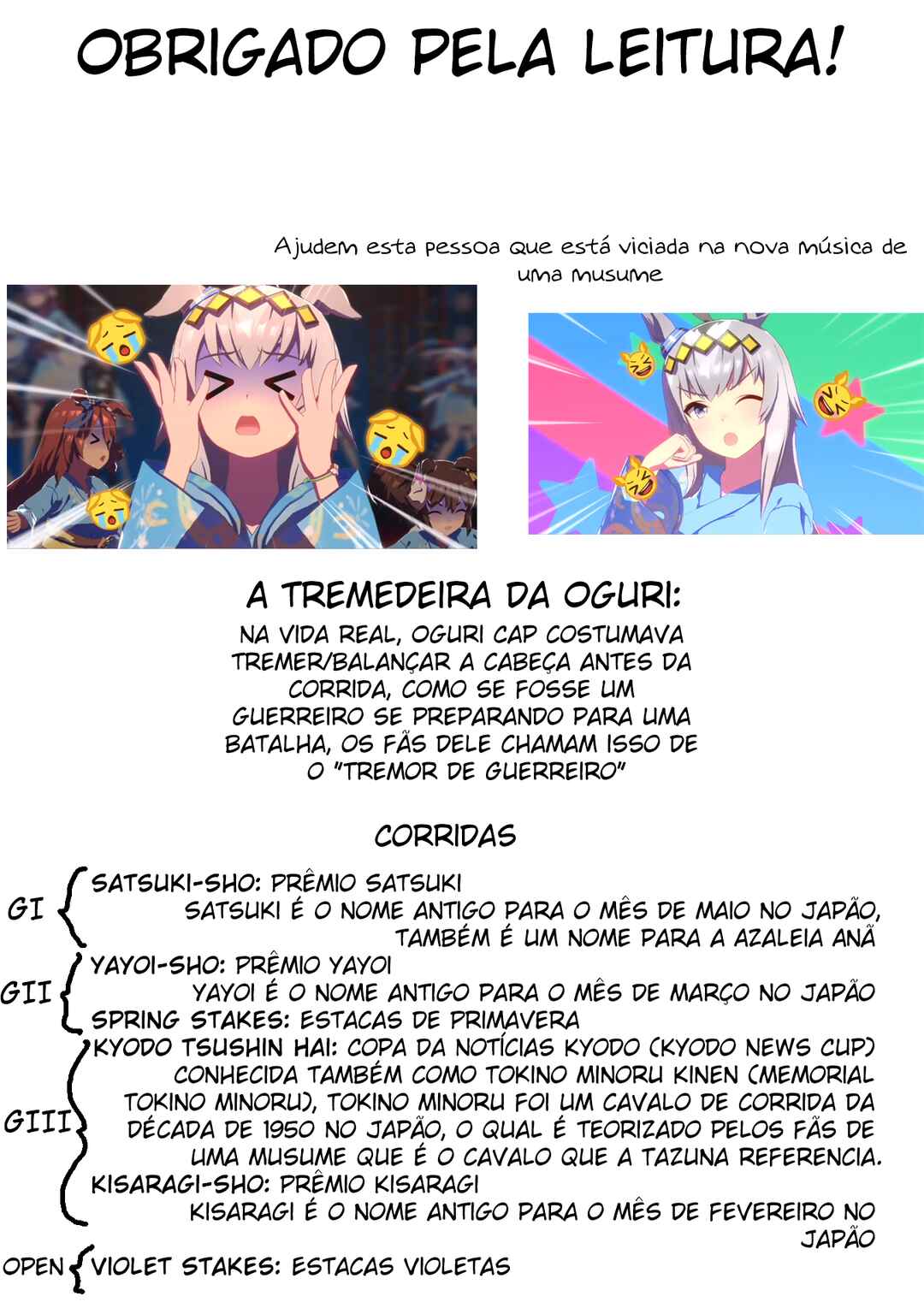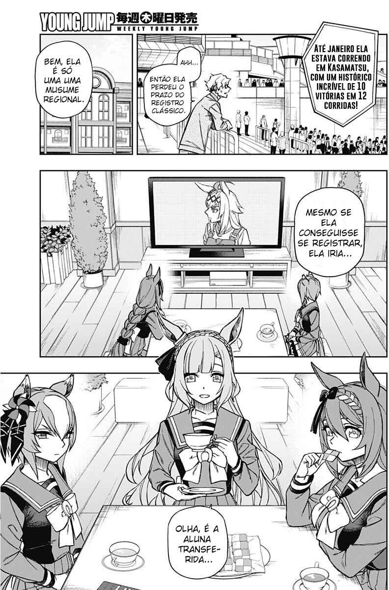 Capítulo 1 - V2 Bem aquiCapítulo 2 - Me arranje uma corridaCapítulo 3 - "Acho que posso confiar nele"Capítulo 4 - Eu vou ganhar da próxima vezCapítulo 5 - Um nível completamente diferenteCapítulo 6 - Vista do topoCapítulo 7 - Junior CrownCapítulo 7.5 - Volume 1 ExtrasCapítulo 8 - Além das expectativasCapítulo 9 - Duas vezesCapítulo 10 - O mais alto padrão na regiãoCapítulo 11 - LicençaCapítulo 12 - A melhor escolhaCapítulo 13 - "Então ganhe a corrida"Capítulo 14 - "O que você está fazendo?"Capítulo 15 - MonstroCapítulo 16 - "Obrigada Kasamatsu"Capítulo 16.5 - Volume 2 ExtrasCapítulo 17 - Academia TracenCapítulo 18 - Registro da classe clássicaCapítulo 19 - Primeira corridaCapítulo 20 - Tremendo de entusiasmoCapítulo 21 - IncomparávelCapítulo 22 - Mainichi HaiCapítulo 23 - "Uma Uma Musume qualquer iria..."Capítulo 24 - "Não há ideais sem sonhos"Capítulo 25 - DignidadeCapítulo 26 - Nippon DerbyCapítulo 26.5 - Volume 3 ExtrasCapítulo 27 - O cume mais altoCapítulo 28 - "Farei meu próprio caminho"Capítulo 29 - A mais forteCapítulo 30 - A melhor Uma Musume do JapãoCapítulo 31 - Férias de verãoCapítulo 32 - Mainichi OkanCapítulo 33 - "Onde ninguém pode te encostar"Capítulo 34 - A Estrela de KasamatsuCapítulo 35 - Uniforme de CorridaCapítulo 36 - "Hoje ela está diferente"Capítulo 36.5 - Volume 4 ExtrasCapítulo 37 - Tennou-Sho (Outono)Capítulo 38 - "Avançar com tudo!"Capítulo 39 - "Tudo para hoje"Capítulo 40 - "Pisadas de um Monstro"Capítulo 41 - Relâmpago BrancoCapítulo 42 - A ZonaCapítulo 43 - A melhor do JapãoCapítulo 44 - "Aquela que eu quero vencer"Capítulo 45 - MilagreCapítulo 46 - "Nossa história"Capítulo 47 - "Eu vou ficar mais forte"Capítulo 47.5 - Volume 5 ExtrasCapítulo 48 - Nível mundialCapítulo 49 - Minha inimigaCapítulo 50 - "Marcado na história"Capítulo 51 - Japan CupCapítulo 52 - Disputa por posiçõesCapítulo 53 - "GOGOGOGO!!"Capítulo 54 - PresençaCapítulo 55 - Wild JokerCapítulo 56 - Se você puderCapítulo 57 - Dangerous ZoneCapítulo 57.5 - Volume 6 ExtrasCapítulo 58 - "Para provar a mim mesma"Capítulo 59 - Até que bem parecidasCapítulo 60 - Não acabe sendo apenas uma derrotaCapítulo 61 - Domínio desconhecidoCapítulo 62 - Estudo de campoCapítulo 63 - Ainda não vou desistirCapítulo 64 - Conheço melhor do que ninguémCapítulo 65 - Neste "Domínio"Capítulo 66 - A RespostaCapítulo 67 - "Take it easy"Capítulo 67.5 - Volume 7 ExtrasCapítulo 68 - Arima KinenCapítulo 69 - Seja você mesmaCapítulo 70 - ChaticeCapítulo 71 - Contagem RegressivaCapítulo 72 - Chute de BalaCapítulo 73 - Fantasma CinzaCapítulo 74 - Venha correr comigoCapítulo 75 - Uma nova eraCapítulo 76 - Bem vinda de voltaCapítulo 76.5 - Volume 8 ExtrasCapítulo 77 - A Arma Suprema de OoiCapítulo 78 - Tokyo DaishotenCapítulo 79 - Nova eraCapítulo 80 - Grande preçoCapítulo 81 - HavaíCapítulo 82 - RecuperadaCapítulo 83 - "Você tirou as palavras da minha boca"Capítulo 84 - Família MejiroCapítulo 85 - Sendo perseguidaCapítulo 85.5 - Volume 9 ExtrasCapítulo 86 - A corrida nunca vai acabarCapítulo 87 - Hábitos