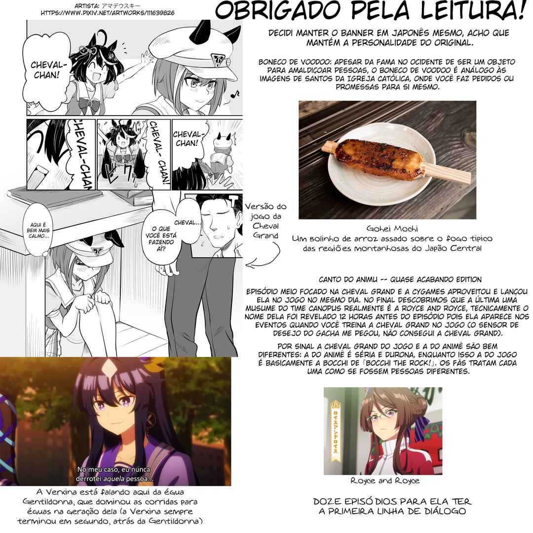Capítulo 1 - V2 Bem aquiCapítulo 2 - Me arranje uma corridaCapítulo 3 - "Acho que posso confiar nele"Capítulo 4 - Eu vou ganhar da próxima vezCapítulo 5 - Um nível completamente diferenteCapítulo 6 - Vista do topoCapítulo 7 - Junior CrownCapítulo 7.5 - Volume 1 ExtrasCapítulo 8 - Além das expectativasCapítulo 9 - Duas vezesCapítulo 10 - O mais alto padrão na regiãoCapítulo 11 - LicençaCapítulo 12 - A melhor escolhaCapítulo 13 - "Então ganhe a corrida"Capítulo 14 - "O que você está fazendo?"Capítulo 15 - MonstroCapítulo 16 - "Obrigada Kasamatsu"Capítulo 16.5 - Volume 2 ExtrasCapítulo 17 - Academia TracenCapítulo 18 - Registro da classe clássicaCapítulo 19 - Primeira corridaCapítulo 20 - Tremendo de entusiasmoCapítulo 21 - IncomparávelCapítulo 22 - Mainichi HaiCapítulo 23 - "Uma Uma Musume qualquer iria..."Capítulo 24 - "Não há ideais sem sonhos"Capítulo 25 - DignidadeCapítulo 26 - Nippon DerbyCapítulo 26.5 - Volume 3 ExtrasCapítulo 27 - O cume mais altoCapítulo 28 - "Farei meu próprio caminho"Capítulo 29 - A mais forteCapítulo 30 - A melhor Uma Musume do JapãoCapítulo 31 - Férias de verãoCapítulo 32 - Mainichi OkanCapítulo 33 - "Onde ninguém pode te encostar"Capítulo 34 - A Estrela de KasamatsuCapítulo 35 - Uniforme de CorridaCapítulo 36 - "Hoje ela está diferente"Capítulo 36.5 - Volume 4 ExtrasCapítulo 37 - Tennou-Sho (Outono)Capítulo 38 - "Avançar com tudo!"Capítulo 39 - "Tudo para hoje"Capítulo 40 - "Pisadas de um Monstro"Capítulo 41 - Relâmpago BrancoCapítulo 42 - A ZonaCapítulo 43 - A melhor do JapãoCapítulo 44 - "Aquela que eu quero vencer"Capítulo 45 - MilagreCapítulo 46 - "Nossa história"Capítulo 47 - "Eu vou ficar mais forte"Capítulo 47.5 - Volume 5 ExtrasCapítulo 48 - Nível mundialCapítulo 49 - Minha inimigaCapítulo 50 - "Marcado na história"Capítulo 51 - Japan CupCapítulo 52 - Disputa por posiçõesCapítulo 53 - "GOGOGOGO!!"Capítulo 54 - PresençaCapítulo 55 - Wild JokerCapítulo 56 - Se você puderCapítulo 57 - Dangerous ZoneCapítulo 57.5 - Volume 6 ExtrasCapítulo 58 - "Para provar a mim mesma"Capítulo 59 - Até que bem parecidasCapítulo 60 - Não acabe sendo apenas uma derrotaCapítulo 61 - Domínio desconhecidoCapítulo 62 - Estudo de campoCapítulo 63 - Ainda não vou desistirCapítulo 64 - Conheço melhor do que ninguémCapítulo 65 - Neste "Domínio"Capítulo 66 - A RespostaCapítulo 67 - "Take it easy"Capítulo 67.5 - Volume 7 ExtrasCapítulo 68 - Arima KinenCapítulo 69 - Seja você mesmaCapítulo 70 - ChaticeCapítulo 71 - Contagem RegressivaCapítulo 72 - Chute de BalaCapítulo 73 - Fantasma CinzaCapítulo 74 - Venha correr comigoCapítulo 75 - Uma nova eraCapítulo 76 - Bem vinda de voltaCapítulo 76.5 - Volume 8 ExtrasCapítulo 77 - A Arma Suprema de OoiCapítulo 78 - Tokyo DaishotenCapítulo 79 - Nova eraCapítulo 80 - Grande preçoCapítulo 81 - HavaíCapítulo 82 - RecuperadaCapítulo 83 - "Você tirou as palavras da minha boca"Capítulo 84 - Família MejiroCapítulo 85 - Sendo perseguidaCapítulo 85.5 - Volume 9 ExtrasCapítulo 86 - A corrida nunca vai acabarCapítulo 87 - Hábitos