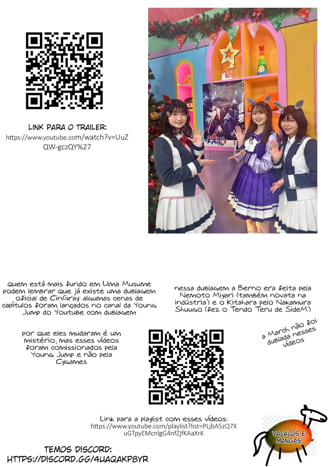 Capítulo 1 - V2 Bem aquiCapítulo 2 - Me arranje uma corridaCapítulo 3 - "Acho que posso confiar nele"Capítulo 4 - Eu vou ganhar da próxima vezCapítulo 5 - Um nível completamente diferenteCapítulo 6 - Vista do topoCapítulo 7 - Junior CrownCapítulo 7.5 - Volume 1 ExtrasCapítulo 8 - Além das expectativasCapítulo 9 - Duas vezesCapítulo 10 - O mais alto padrão na regiãoCapítulo 11 - LicençaCapítulo 12 - A melhor escolhaCapítulo 13 - "Então ganhe a corrida"Capítulo 14 - "O que você está fazendo?"Capítulo 15 - MonstroCapítulo 16 - "Obrigada Kasamatsu"Capítulo 16.5 - Volume 2 ExtrasCapítulo 17 - Academia TracenCapítulo 18 - Registro da classe clássicaCapítulo 19 - Primeira corridaCapítulo 20 - Tremendo de entusiasmoCapítulo 21 - IncomparávelCapítulo 22 - Mainichi HaiCapítulo 23 - "Uma Uma Musume qualquer iria..."Capítulo 24 - "Não há ideais sem sonhos"Capítulo 25 - DignidadeCapítulo 26 - Nippon DerbyCapítulo 26.5 - Volume 3 ExtrasCapítulo 27 - O cume mais altoCapítulo 28 - "Farei meu próprio caminho"Capítulo 29 - A mais forteCapítulo 30 - A melhor Uma Musume do JapãoCapítulo 31 - Férias de verãoCapítulo 32 - Mainichi OkanCapítulo 33 - "Onde ninguém pode te encostar"Capítulo 34 - A Estrela de KasamatsuCapítulo 35 - Uniforme de CorridaCapítulo 36 - "Hoje ela está diferente"Capítulo 36.5 - Volume 4 ExtrasCapítulo 37 - Tennou-Sho (Outono)Capítulo 38 - "Avançar com tudo!"Capítulo 39 - "Tudo para hoje"Capítulo 40 - "Pisadas de um Monstro"Capítulo 41 - Relâmpago BrancoCapítulo 42 - A ZonaCapítulo 43 - A melhor do JapãoCapítulo 44 - "Aquela que eu quero vencer"Capítulo 45 - MilagreCapítulo 46 - "Nossa história"Capítulo 47 - "Eu vou ficar mais forte"Capítulo 47.5 - Volume 5 ExtrasCapítulo 48 - Nível mundialCapítulo 49 - Minha inimigaCapítulo 50 - "Marcado na história"Capítulo 51 - Japan CupCapítulo 52 - Disputa por posiçõesCapítulo 53 - "GOGOGOGO!!"Capítulo 54 - PresençaCapítulo 55 - Wild JokerCapítulo 56 - Se você puderCapítulo 57 - Dangerous ZoneCapítulo 57.5 - Volume 6 ExtrasCapítulo 58 - "Para provar a mim mesma"Capítulo 59 - Até que bem parecidasCapítulo 60 - Não acabe sendo apenas uma derrotaCapítulo 61 - Domínio desconhecidoCapítulo 62 - Estudo de campoCapítulo 63 - Ainda não vou desistirCapítulo 64 - Conheço melhor do que ninguémCapítulo 65 - Neste "Domínio"Capítulo 66 - A RespostaCapítulo 67 - "Take it easy"Capítulo 67.5 - Volume 7 ExtrasCapítulo 68 - Arima KinenCapítulo 69 - Seja você mesmaCapítulo 70 - ChaticeCapítulo 71 - Contagem RegressivaCapítulo 72 - Chute de BalaCapítulo 73 - Fantasma CinzaCapítulo 74 - Venha correr comigoCapítulo 75 - Uma nova eraCapítulo 76 - Bem vinda de voltaCapítulo 76.5 - Volume 8 ExtrasCapítulo 77 - A Arma Suprema de OoiCapítulo 78 - Tokyo DaishotenCapítulo 79 - Nova eraCapítulo 80 - Grande preçoCapítulo 81 - HavaíCapítulo 82 - RecuperadaCapítulo 83 - "Você tirou as palavras da minha boca"Capítulo 84 - Família MejiroCapítulo 85 - Sendo perseguidaCapítulo 85.5 - Volume 9 ExtrasCapítulo 86 - A corrida nunca vai acabarCapítulo 87 - Hábitos
